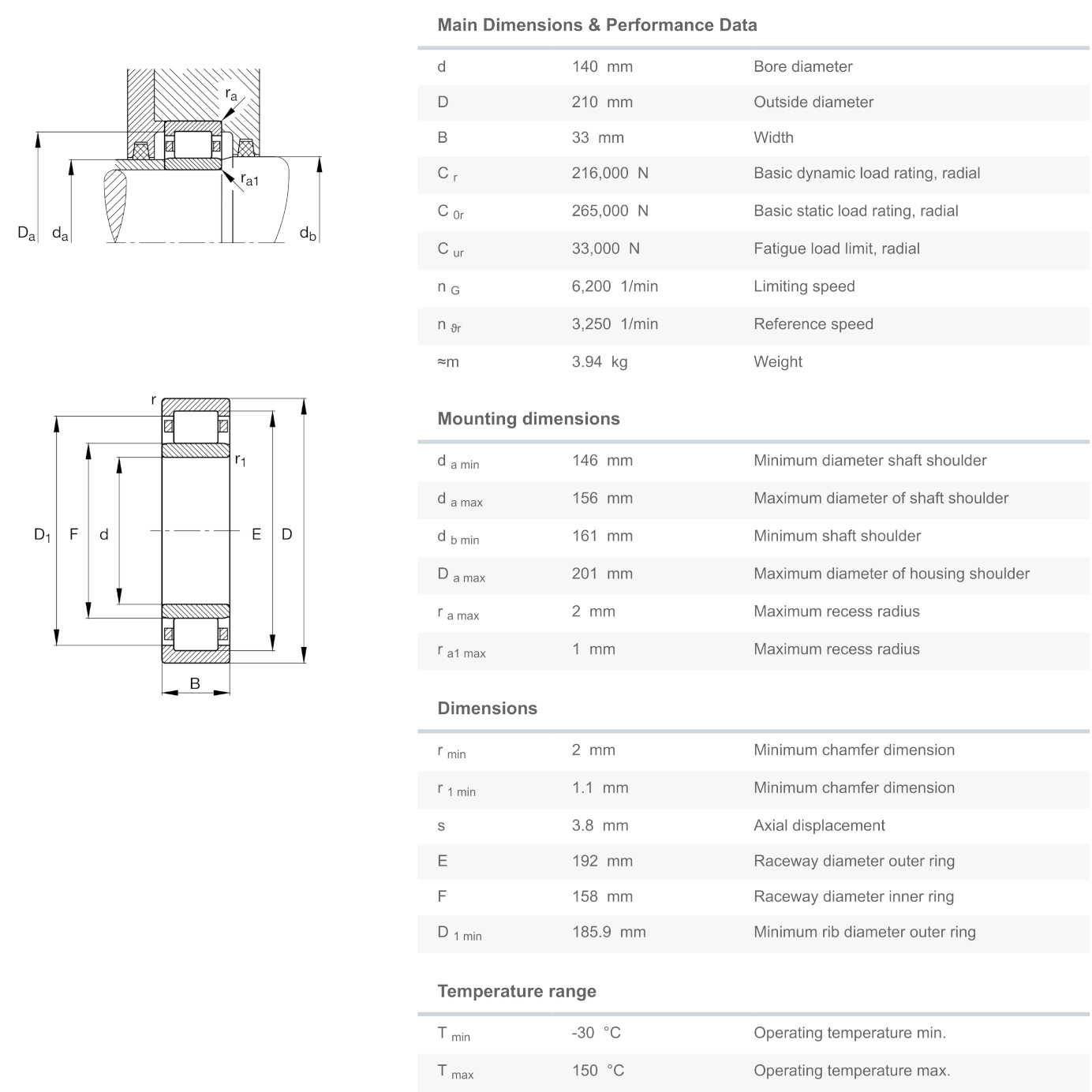 FAG NU1028-XL-M1 มีขนาดวงใน 140 มิล วงนอก 210 มิล หนา 33 มิล เป็นตลับลูกปืนเม็ดทรงกระบอกแถวเดียว มีลักษณะแกนในที่สามารถถอดหลุดออกได้ทั้ง 2 ด้าน ทำให้สะดวกต่อการติดตั้ง รองรับแรงโหลดได้สูงมาก