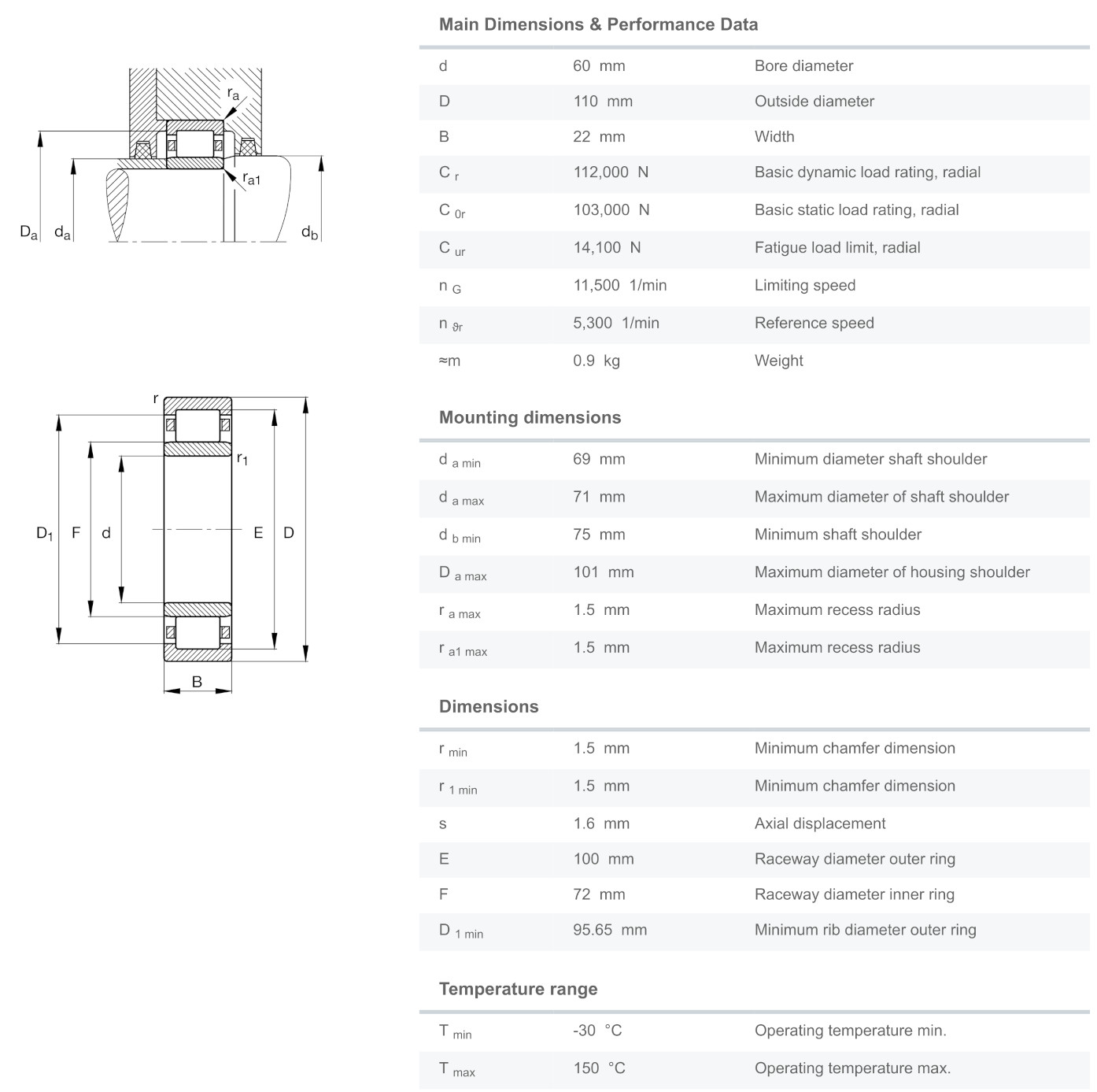 FAG NU212-E-XL-M1 มีขนาดวงใน 60 มิล วงนอก 110 มิล หนา 22 มิล เป็นตลับลูกปืนเม็ดทรงกระบอกแถวเดียว มีลักษณะแกนในที่สามารถถอดหลุดออกได้ทั้ง 2 ด้าน ทำให้สะดวกต่อการติดตั้ง รองรับแรงโหลดได้สูงมาก