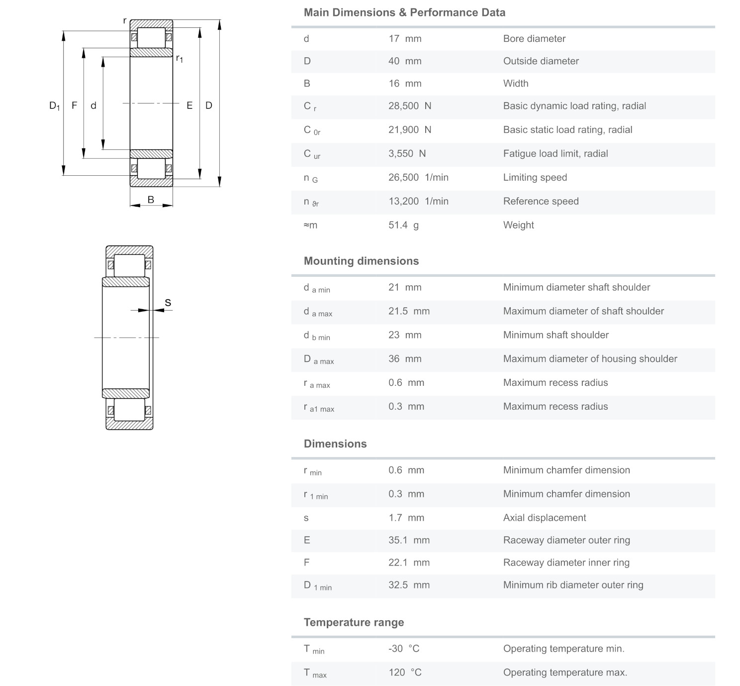 FAG NU2203-E-XL-TVP2 มีขนาดวงใน 17 มิล วงนอก 40 มิล หนา 16 มิล เป็นตลับลูกปืนเม็ดทรงกระบอกแถวเดียว มีลักษณะแกนในที่สามารถถอดหลุดออกได้ทั้ง 2 ด้าน ทำให้สะดวกต่อการติดตั้ง รองรับแรงโหลดได้สูงมาก