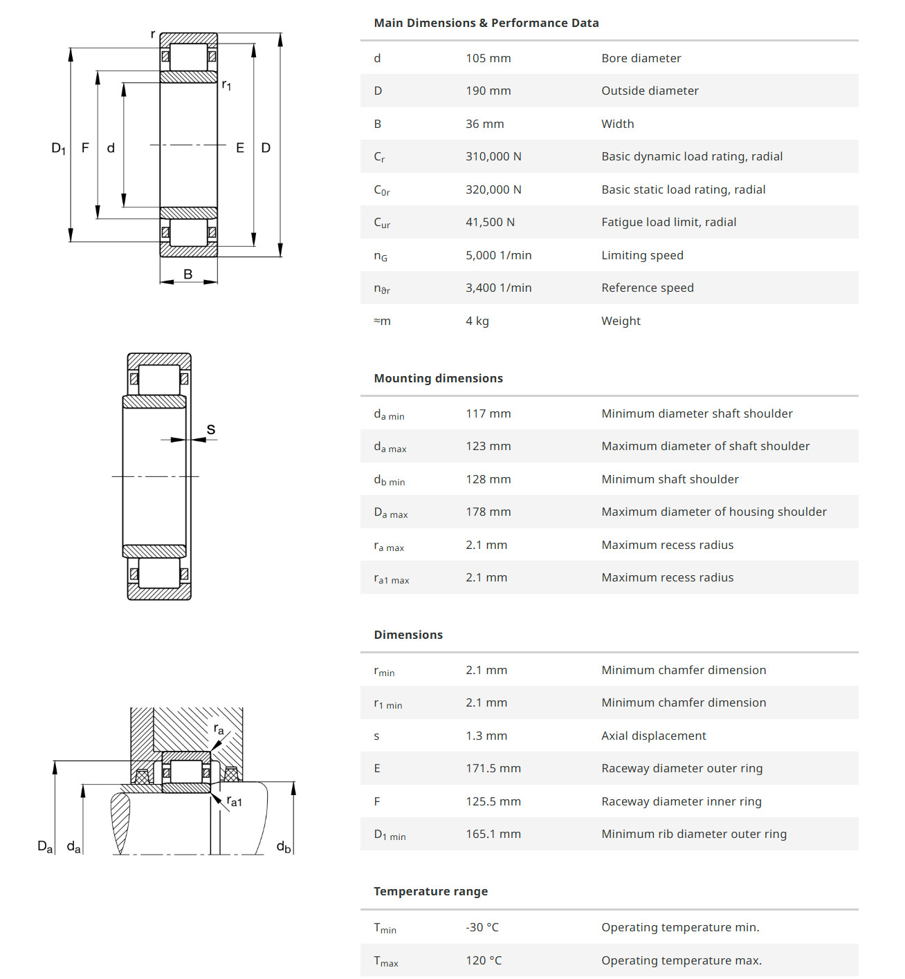 FAG NU221-E-XL-TVP2-C3 มีขนาดวงใน 105 มิล วงนอก 190 มิล หนา 36 มิล เป็นตลับลูกปืนเม็ดทรงกระบอก NU แกนในสามารถถอดหลุดออกได้ทั้งสองด้าน ทำให้สะดวกต่อการติดตั้ง รองรับแรงโหลดได้สูงมาก
