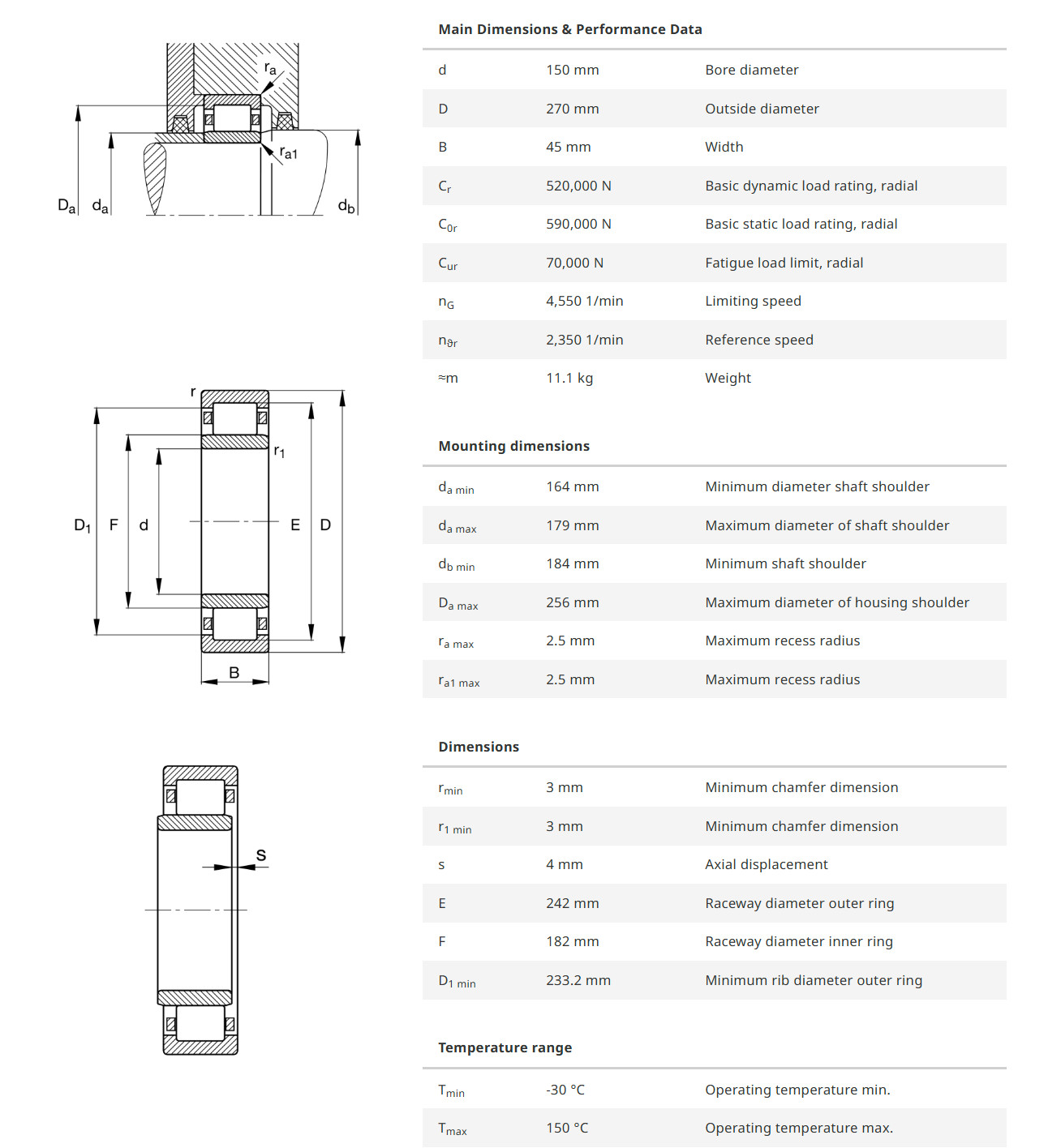 FAG NU230-E-XL-M1 มีขนาดวงใน 150 มิล วงนอก 270 มิล หนา 45 มิล เป็นตลับลูกปืนเม็ดทรงกระบอก NU แกนในสามารถถอดหลุดออกได้ทั้งสองด้าน ทำให้สะดวกต่อการติดตั้ง รองรับแรงโหลดได้สูงมาก