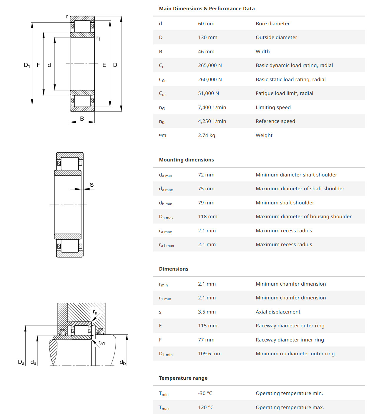 FAG NU2312-E-XL-TVP2-C3 มีขนาดวงใน 60 มิล วงนอก 130 มิล หนา 46 มิล เป็นตลับลูกปืนเม็ดทรงกระบอก NU แกนในสามารถถอดหลุดออกได้ทั้งสองด้าน ทำให้สะดวกต่อการติดตั้ง รองรับแรงโหลดได้สูงมาก