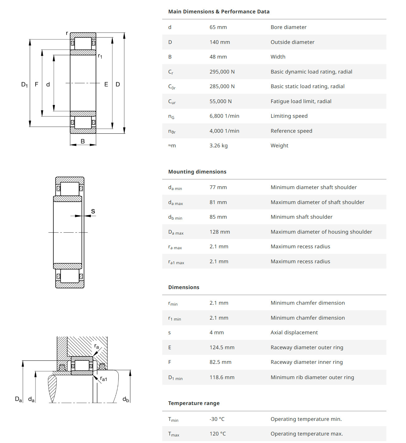 FAG NU2313-E-XL-TVP2 มีขนาดวงใน 65 มิล วงนอก 140 มิล หนา 48 มิล เป็นตลับลูกปืนเม็ดทรงกระบอก NU แกนในสามารถถอดหลุดออกได้ทั้งสองด้าน ทำให้สะดวกต่อการติดตั้ง รองรับแรงโหลดได้สูงมาก