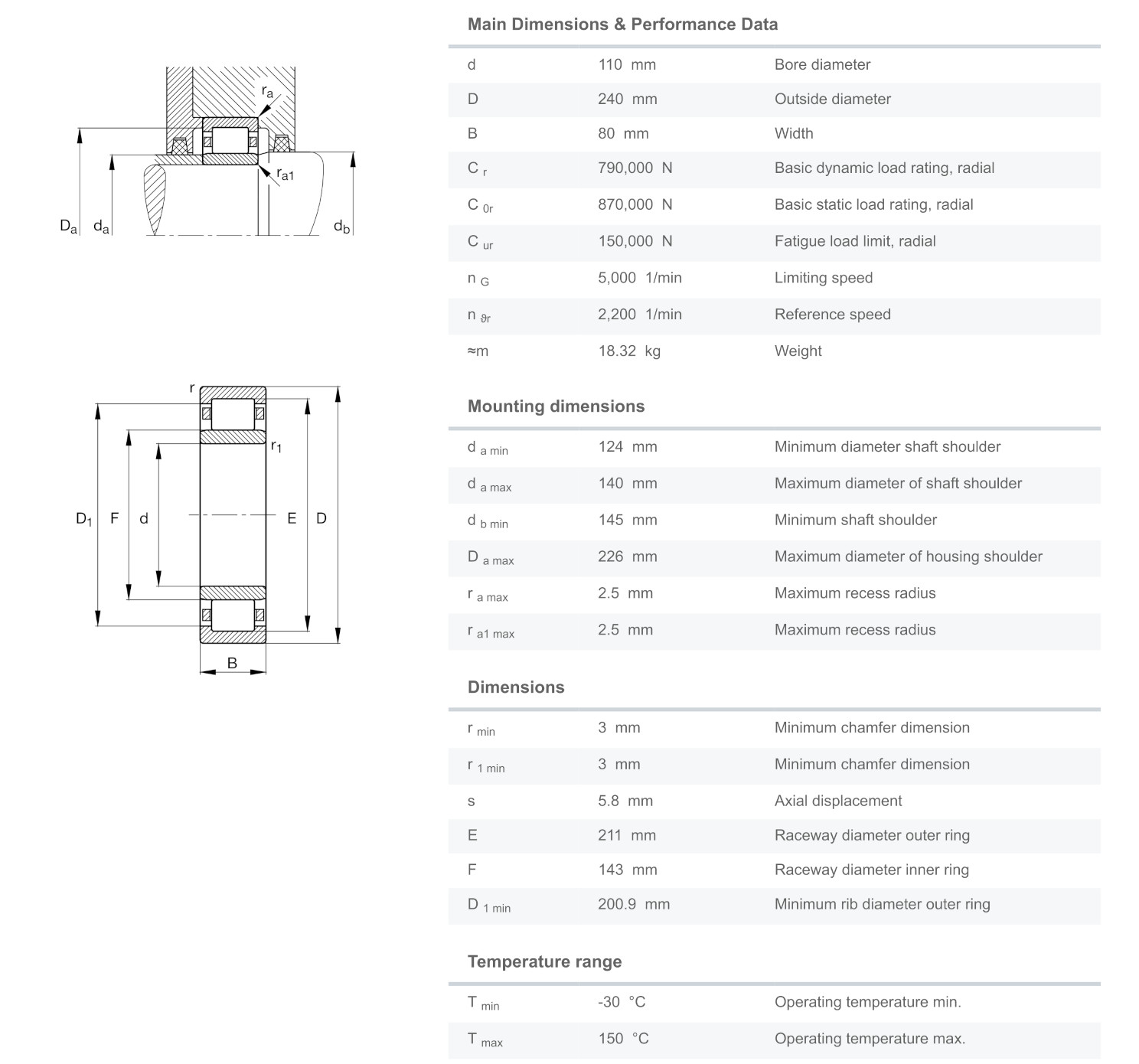 FAG NU2322-E-XL-M1 มีขนาดวงใน 110 มิล วงนอก 240 มิล หนา 80 มิล เป็นตลับลูกปืนเม็ดทรงกระบอก NU แกนในสามารถถอดหลุดออกได้ทั้งสองด้าน ทำให้สะดวกต่อการติดตั้ง รองรับแรงโหลดได้สูงมาก