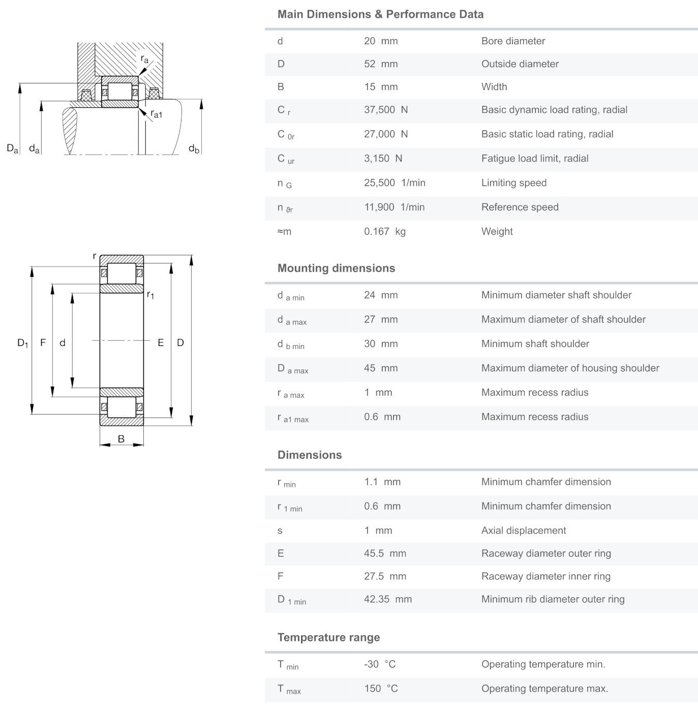 FAG NU304-E-XL-M1 มีขนาดวงใน 20 มิล วงนอก 52 มิล หนา 15 มิล เป็นตลับลูกปืนเม็ดทรงกระบอกแถวเดียว รังทองเหลือง มีลักษณะแกนในที่สามารถถอดหลุดออกได้ทั้ง 2 ด้าน ทำให้สะดวกต่อการติดตั้ง รองรับแรงโหลดได้สูงมาก