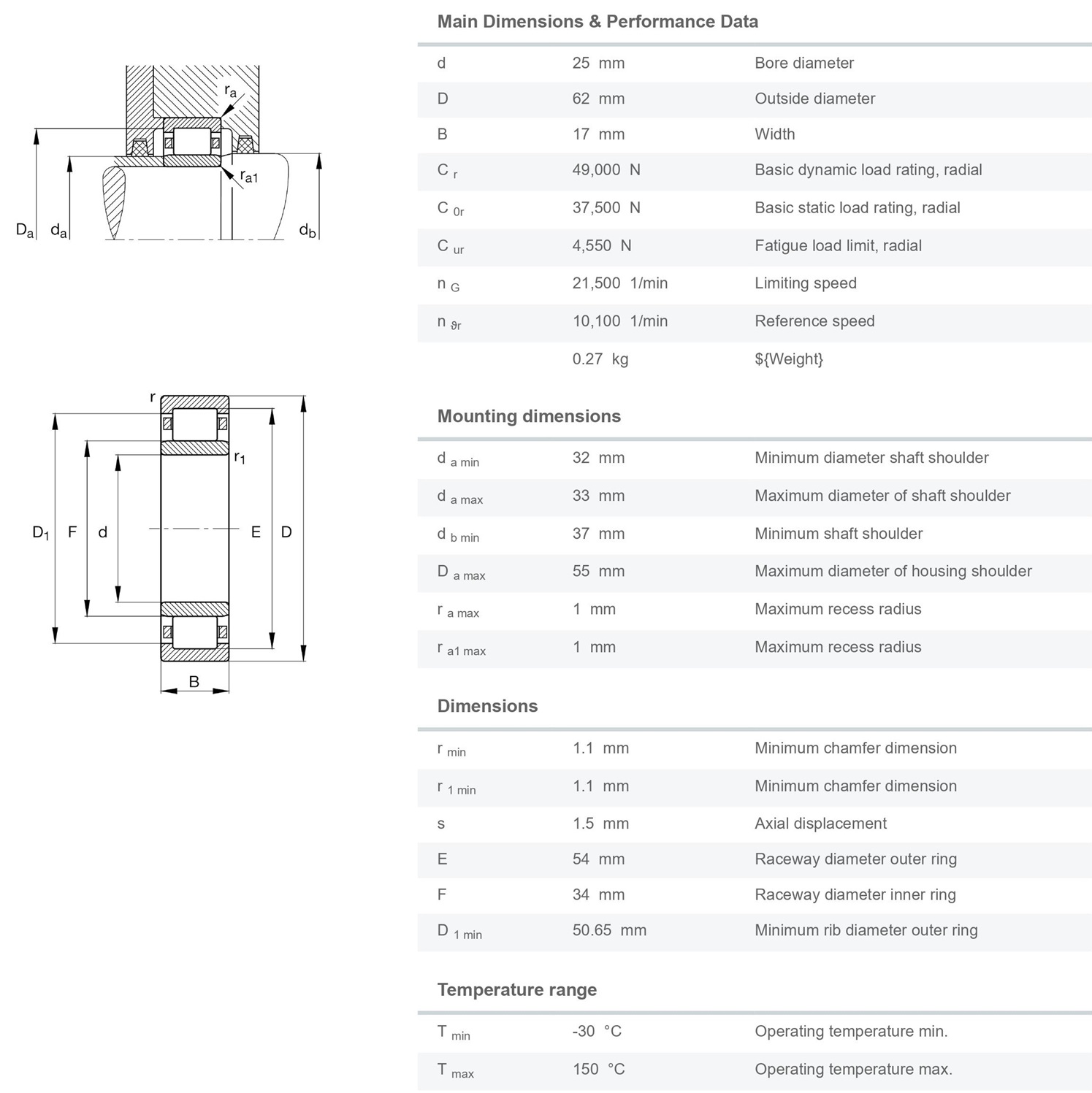 FAG NU305-E-XL-C3 มีขนาดวงใน 25 มิล วงนอก 62 มิล หนา 17 มิล เป็นตลับลูกปืนเม็ดทรงกระบอก แถวเดี่ยว NU Design รองรับโหลดในแนวรัศมีได้สูง มีลักษณะแกนในที่สามารถถอดหลุดออกได้ทั้ง 2 ด้าน ทำให้ง่ายต่อการติดตั้ง