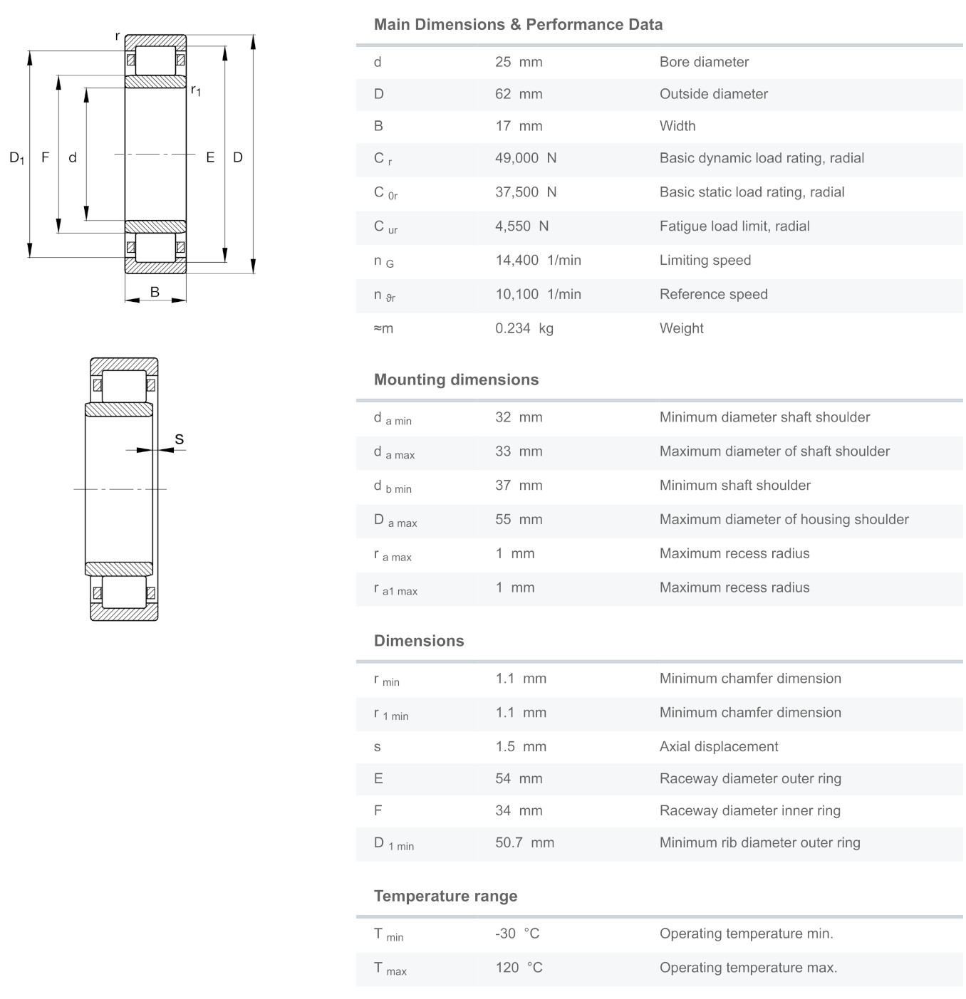 FAG NU305-E-TVP2 มีขนาดวงใน 25 มิล วงนอก 62 มิล หนา 17 มิล เป็นตลับลูกปืนเม็ดทรงกระบอก แถวเดี่ยว NU Design รองรับโหลดในแนวรัศมีได้สูง มีลักษณะแกนในที่สามารถถอดหลุดออกได้ทั้ง 2 ด้าน ทำให้ง่ายต่อการติดตั้ง
