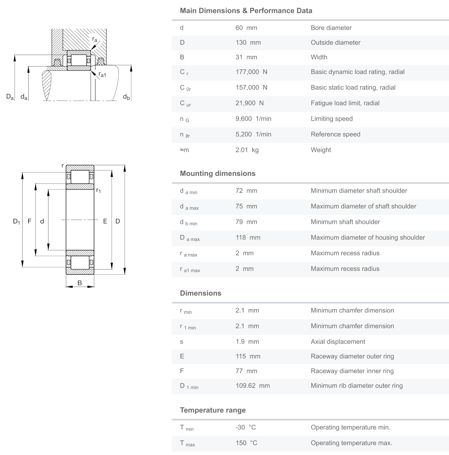 FAG NU312-E-XL-M1-C3 มีขนาดวงใน 60 มิล วงนอก 130 มิล หนา 31 มิล เป็นตลับลูกปืนเม็ดทรงกระบอกแถวเดียว NU Design มีลักษณะแกนในที่สามารถถอดหลุดออกได้ทั้ง 2 ด้าน ทำให้สะดวกต่อการติดตั้ง รองรับแรงโหลดได้สูงมาก
