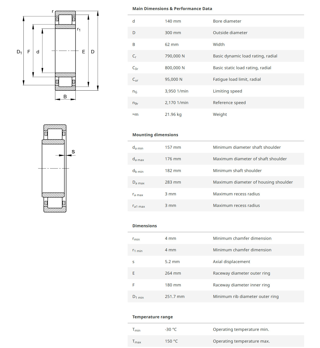 FAG NU328-E-M1-C3 มีขนาดวงใน 140 มิล วงนอก 300 มิล หนา 62 มิล เป็นตลับลูกปืนเม็ดทรงกระบอก NU แกนในสามารถถอดหลุดออกได้ทั้งสองด้าน ทำให้สะดวกต่อการติดตั้ง รองรับแรงโหลดได้สูงมาก