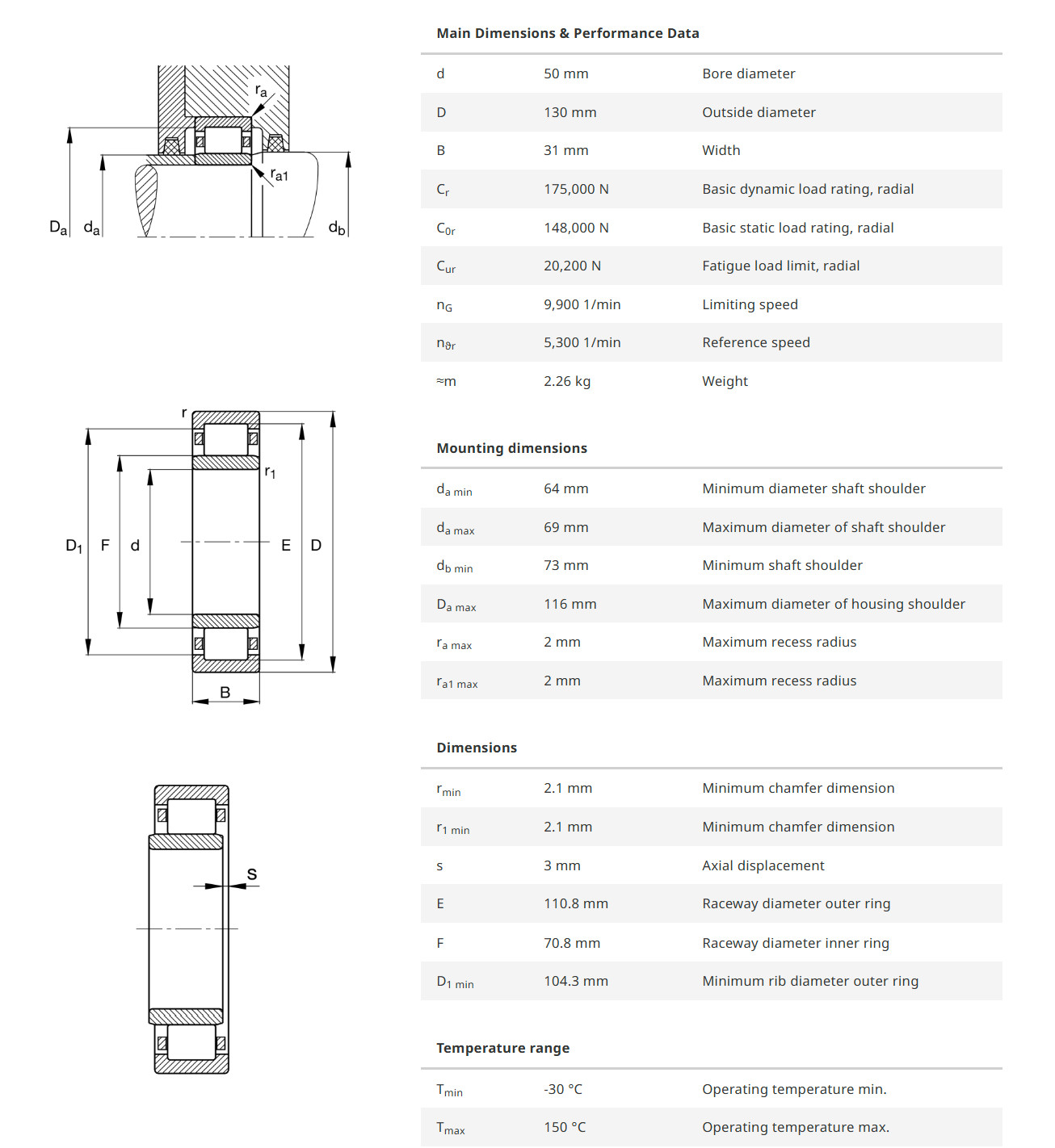 FAG NU410-XL-M1-C3 มีขนาดวงใน 50 มิล วงนอก 130 มิล หนา 31 มิล เป็นตลับลูกปืนเม็ดทรงกระบอกแถวเดียว NU Design มีลักษณะแกนในที่สามารถถอดหลุดออกได้ทั้ง 2 ด้าน ทำให้สะดวกต่อการติดตั้ง รองรับแรงโหลดได้สูงมาก