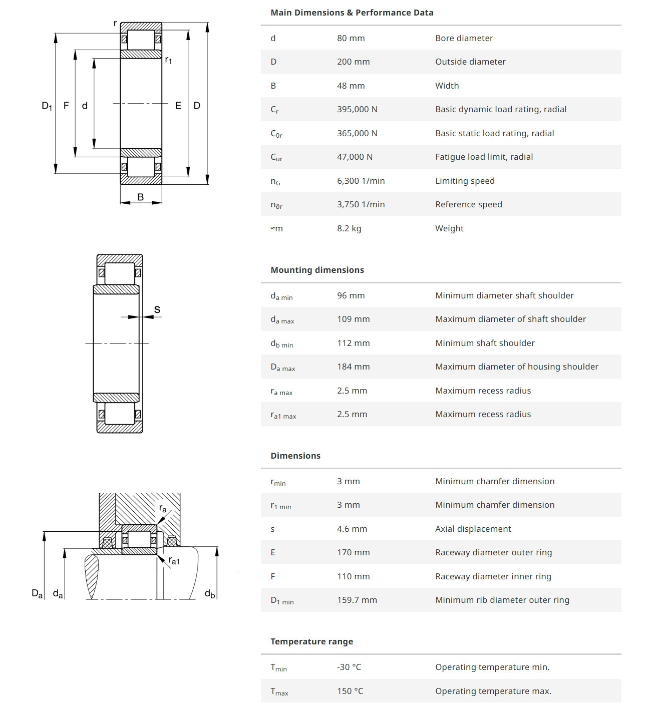 FAG NU416-XL-M1-C3 มีขนาดวงใน 80 มิล วงนอก 200 มิล หนา 48 มิล เป็นตลับลูกปืนเม็ดทรงกระบอกแถวเดียว NU Design มีลักษณะแกนในที่สามารถถอดหลุดออกได้ทั้ง 2 ด้าน ทำให้สะดวกต่อการติดตั้ง รองรับแรงโหลดได้สูงมาก แบริ่งอุตสาหกรรม