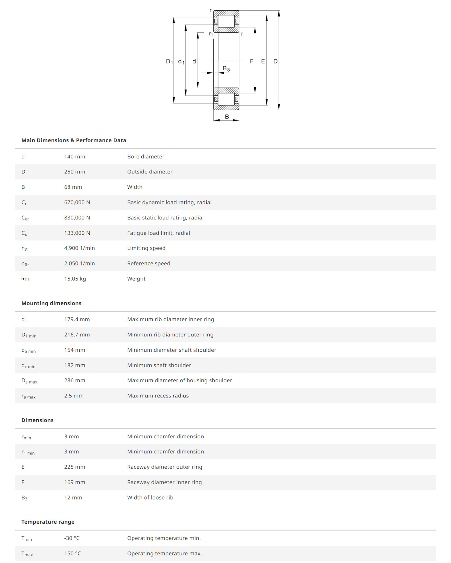 FAG NUP2228-E-XL-M1 มีขนาดวงใน 140 มิล วงนอก 250 มิล หนา 68 มิล เป็นตลับลูกปืนเม็ดทรงกระบอก NUP แกนในมีบ่าขึ้นมาหนึ่งด้าน อีกด้านมีแผ่นฝาประกบ ทำให้สะดวกต่อการติดตั้ง รองรับแรงโหลดได้สูงมาก