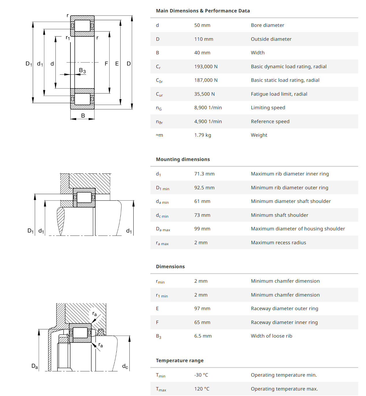 FAG NUP2310-E-XL-TVP2 มีขนาดวงใน 50 มิล วงนอก 110 มิล หนา 40 มิล เป็นตลับลูกปืนเม็ดทรงกระบอก NUP แกนในมีบ่าขึ้นมาหนึ่งด้าน อีกด้านมีแผ่นฝาประกบ ทำให้สะดวกต่อการติดตั้ง รองรับแรงโหลดได้สูงมาก