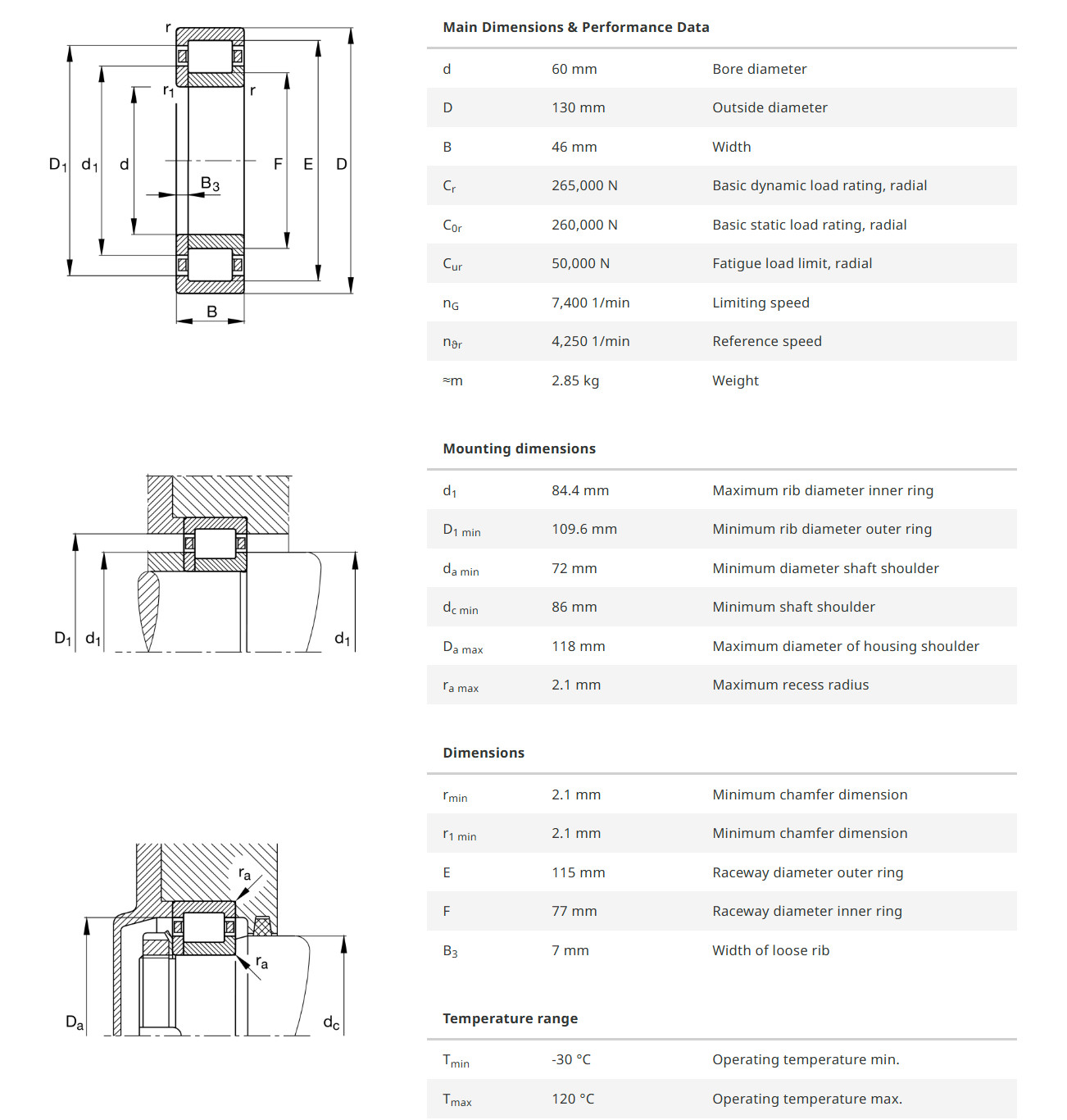 FAG NUP2312-E-XL-TVP2-C3 มีขนาดวงใน 60 มิล วงนอก 130 มิล หนา 46 มิล เป็นตลับลูกปืนเม็ดทรงกระบอก NUP แกนในมีบ่าขึ้นมาหนึ่งด้าน อีกด้านมีแผ่นฝาประกบ ทำให้สะดวกต่อการติดตั้ง รองรับแรงโหลดได้สูงมาก