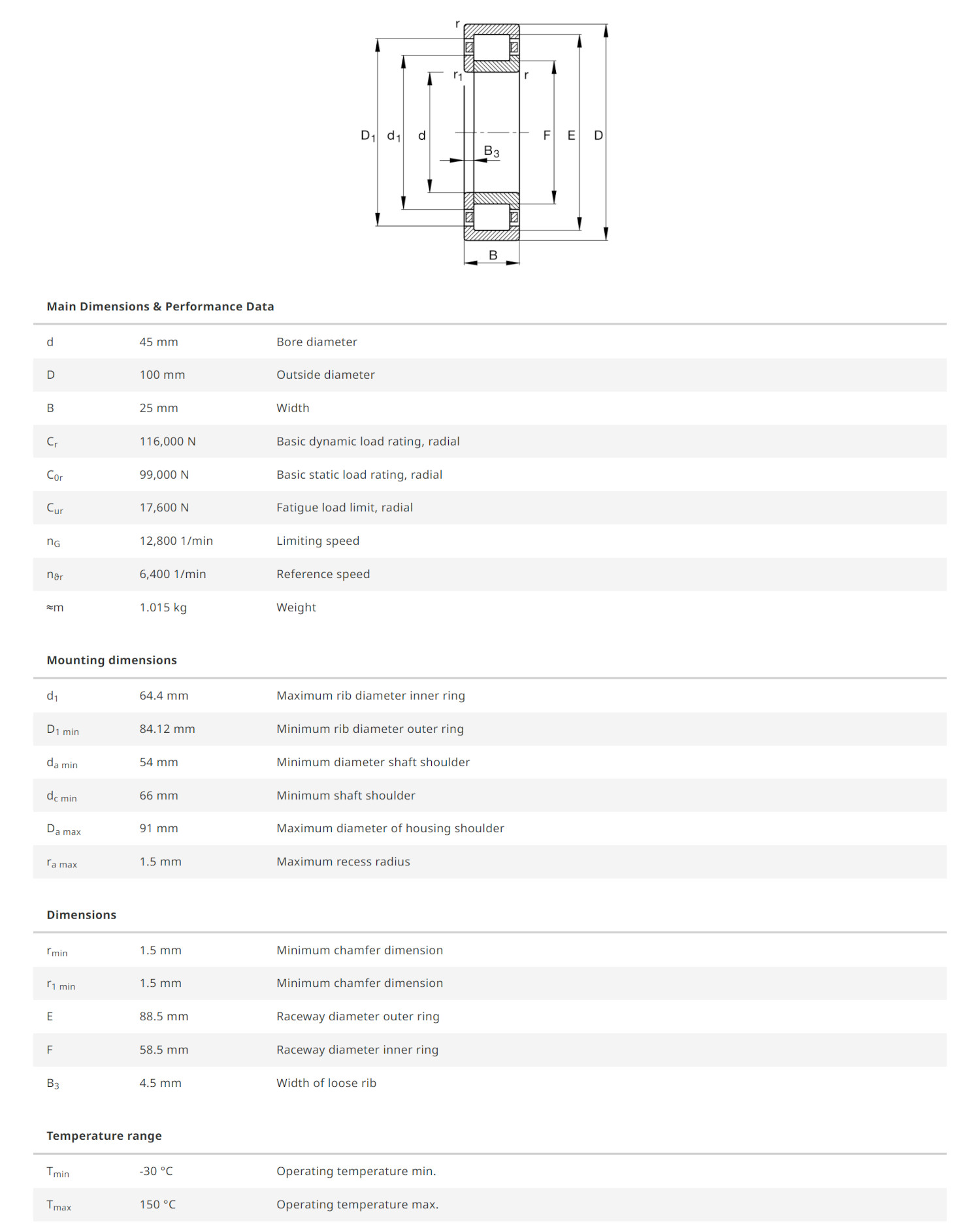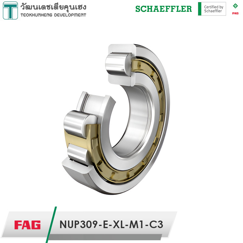 FAG NUP309-E-XL-M1 มีขนาดวงใน 45 มิล วงนอก 100 มิล หนา 25 มิล เป็นตลับลูกปืนเม็ดทรงกระบอก NUP แกนในมีบ่าขึ้นมาหนึ่งด้าน อีกด้านมีแผ่นฝาประกบ ทำให้สะดวกต่อการติดตั้ง รองรับแรงโหลดได้สูงมาก