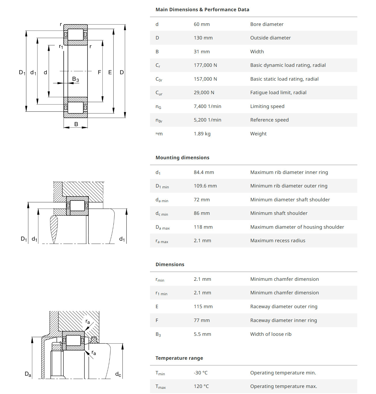 FAG NUP312-E-XL-TVP2 มีขนาดวงใน 60 มิล วงนอก 130 มิล หนา 31 มิล เป็นตลับลูกปืนเม็ดทรงกระบอก NUP แกนในมีบ่าขึ้นมาหนึ่งด้าน อีกด้านมีแผ่นฝาประกบ ทำให้สะดวกต่อการติดตั้ง รองรับแรงโหลดได้สูงมาก