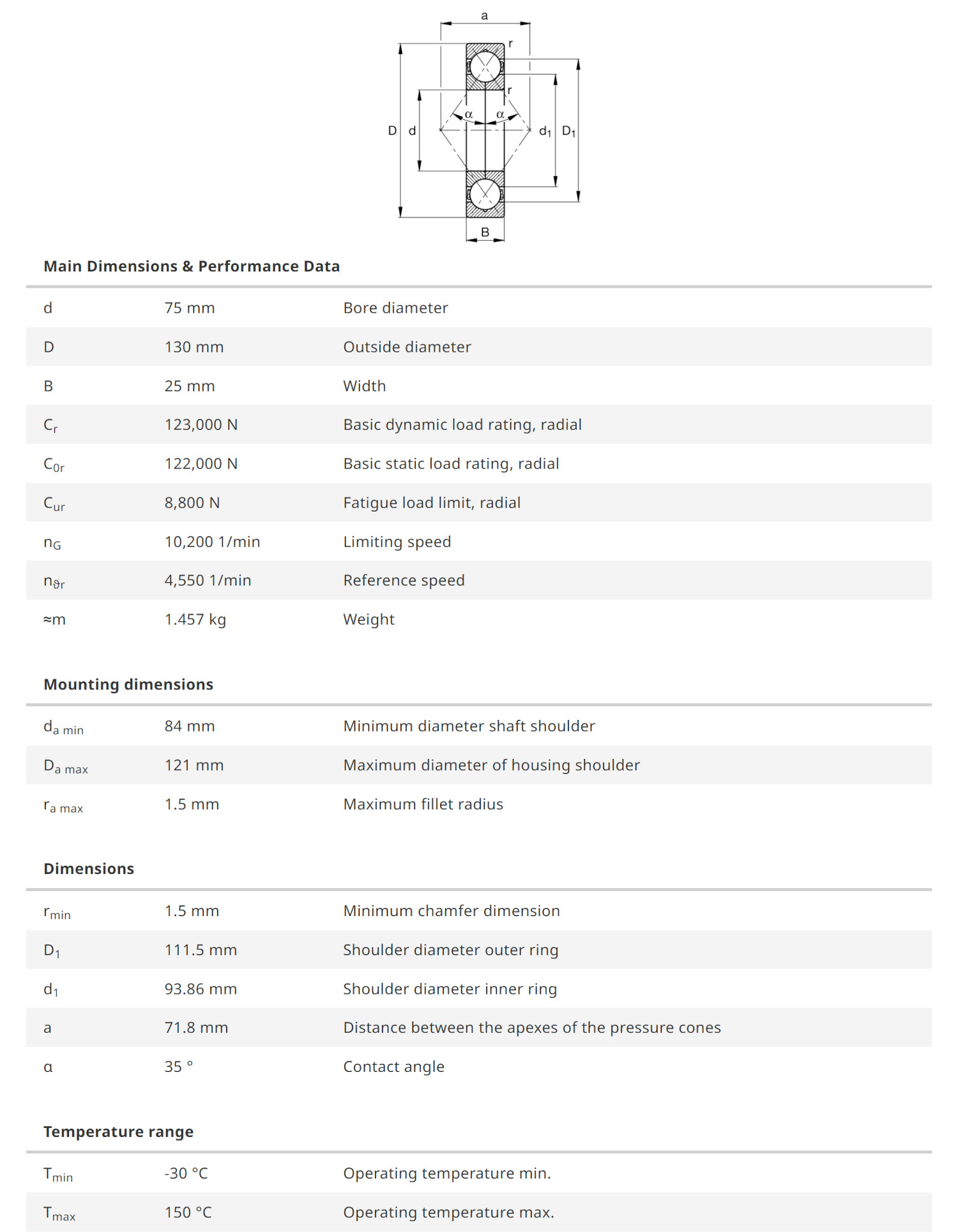 FAG QJ215-XL-MPA มีขนาดวงใน 75 มิล วงนอก 130 มิล หนา 25 มิล เป็นตลับลูกปืนเม็ดกลมมุมสัมผัสสี่จุด รังทองเหลือง แกนในสามารถแยกถอดประกอบได้เป็นสองส่วน รองรับความเร็วรอบสูง รองรับแรงโหลดสูงในแนวแกน