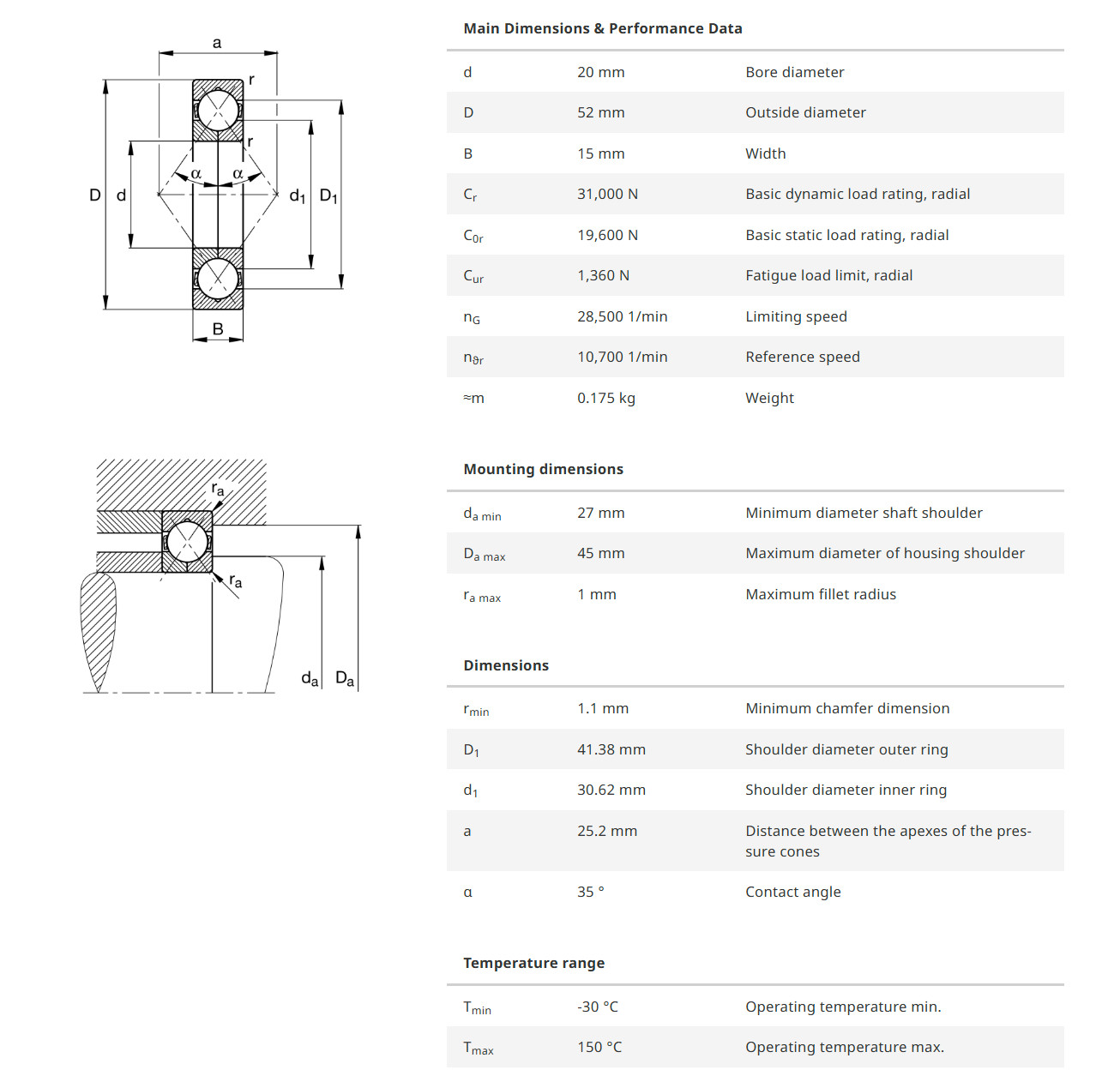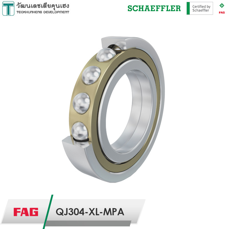 FAG QJ304-XL-MPA มีขนาดวงใน 20 มิล วงนอก 52 มิล หนา 15 มิล เป็นตลับลูกปืนเม็ดกลมมุมสัมผัสสี่จุด รังทองเหลือง แกนในสามารถแยกถอดประกอบได้เป็นสองส่วน รองรับความเร็วรอบสูง รองรับแรงโหลดสูงในแนวแกน