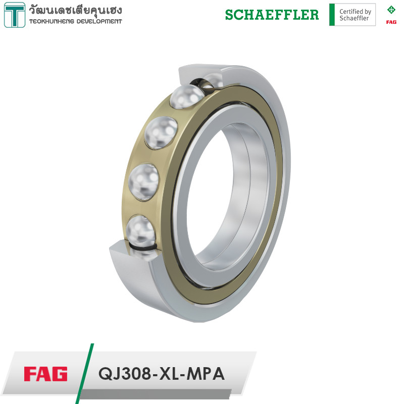 FAG QJ308-XL-MPA มีขนาดวงใน 40 มิล วงนอก 90 มิล หนา 23 มิล เป็นตลับลูกปืนเม็ดกลมมุมสัมผัสสี่จุด รังทองเหลือง แกนในสามารถแยกถอดประกอบได้เป็นสองส่วน รองรับความเร็วรอบสูง รองรับแรงโหลดสูงในแนวแกน