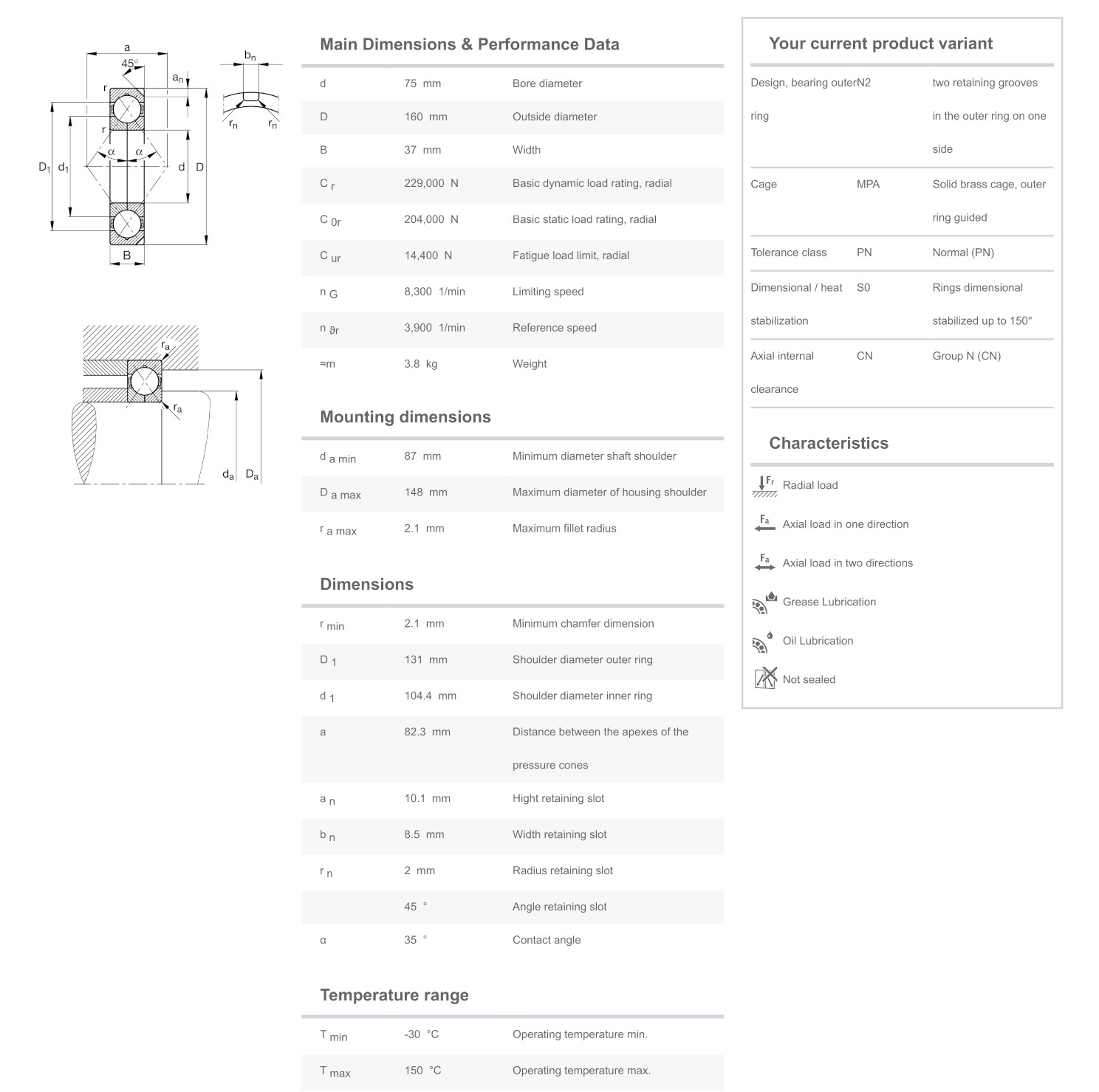 FAG QJ315-XL-N2-MPA มีขนาดวงใน 75 มิล วงนอก 160 มิล หนา 37 มิล เป็นตลับลูกปืนเม็ดกลมมุมสัมผัสสี่จุด รังทองเหลือง แกนในสามารถแยกถอดประกอบได้เป็นสองส่วน รองรับความเร็วรอบสูง รองรับแรงโหลดสูงในแนวแกน