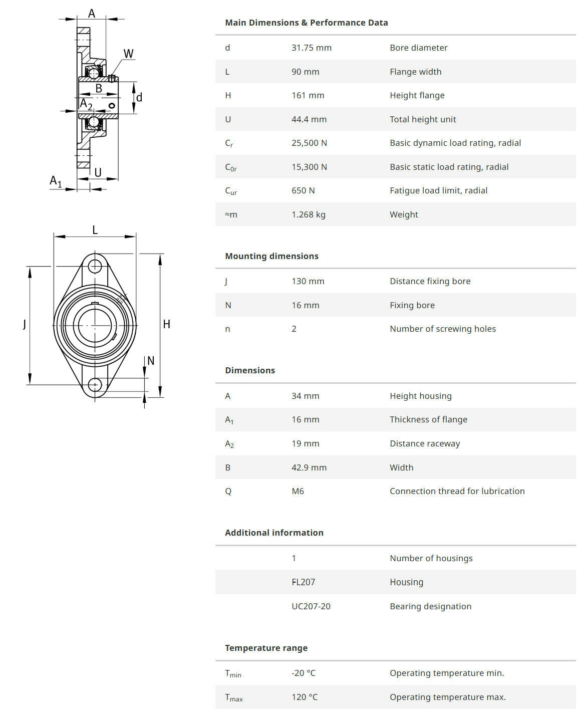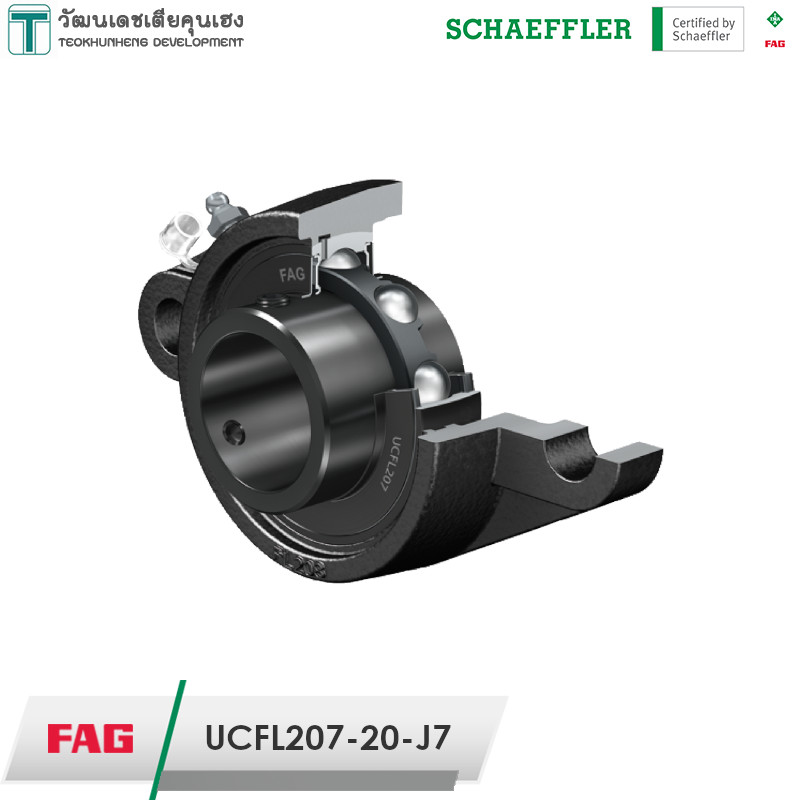 FAG UCFL207-20-J7 เป็นตลับลูกปืนที่มาพร้อมเสื้อตุ๊กตาเหล็กหล่อ แบบหน้าแปลนรูปไข่ รูเพลาหนึ่งนิ้วสองหุน 1-1/4″ หรือ 31.75 มิล แกนในของลูกปืนยื่นออกมาทั้งสองด้าน สามารถล็อคเพลาได้ด้วยการใช้สกรู มีซีลป้องกันฝุ่น
