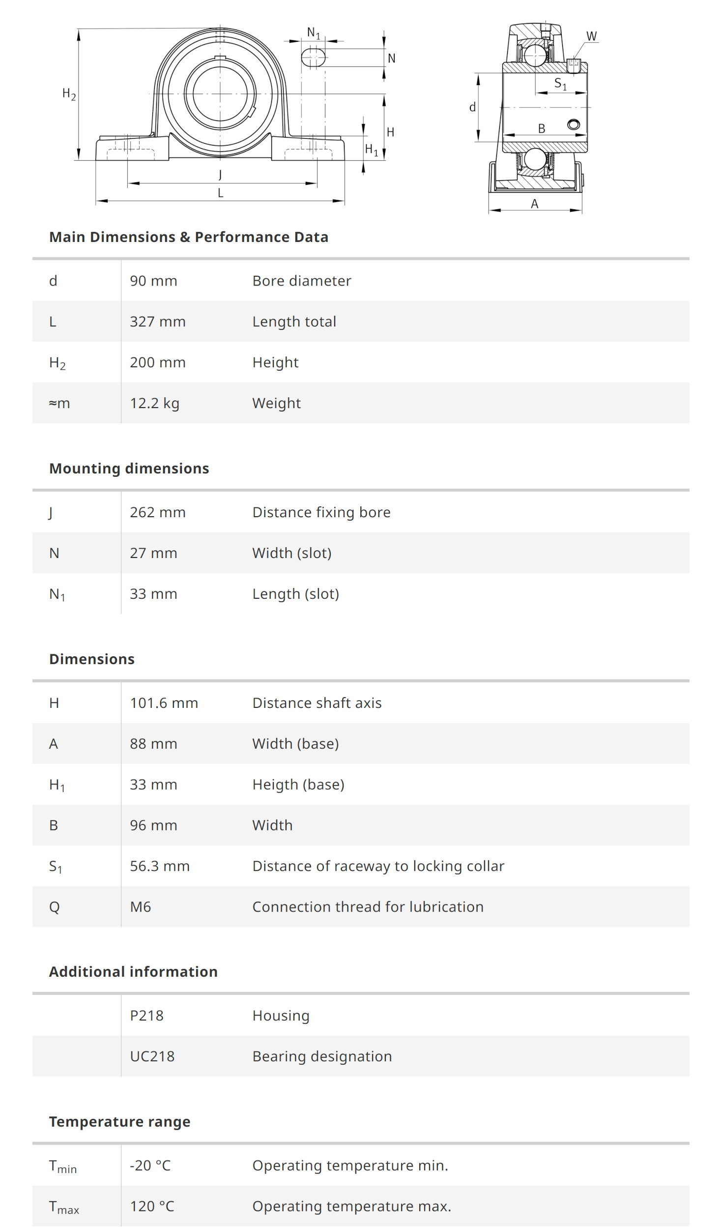 FAG UCP218-J7 เป็นตลับลูกปืนที่มาพร้อมเสื้อตุ๊กตาเหล็กหล่อ แบบขาตั้ง รูเพลา 90 มิล แกนในของลูกปืนยื่นออกมาทั้งสองด้าน สามารถล็อคเพลาได้ด้วยการใช้สกรู มีซีลป้องกันฝุ่น