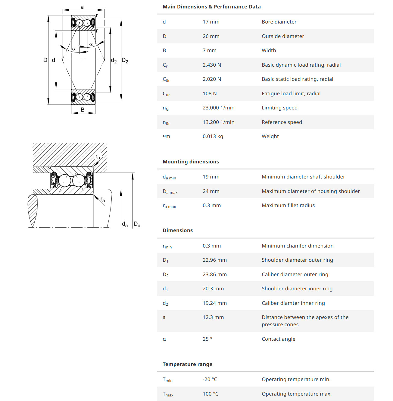INA 3803-2Z มีขนาดวงใน 17 มิล วงนอก 26 มิล หนา 7 มิล เป็นตลับลูกปืนเม็ดกลมสองแถว มุมสัมผัส 25° องศา มีฝาแบบไม่สัมผัสปิด 2 ด้าน เหมาะสำหรับรองรับแรงโหลดได้มากทั้งในแนวรัศมีและแนวแกน