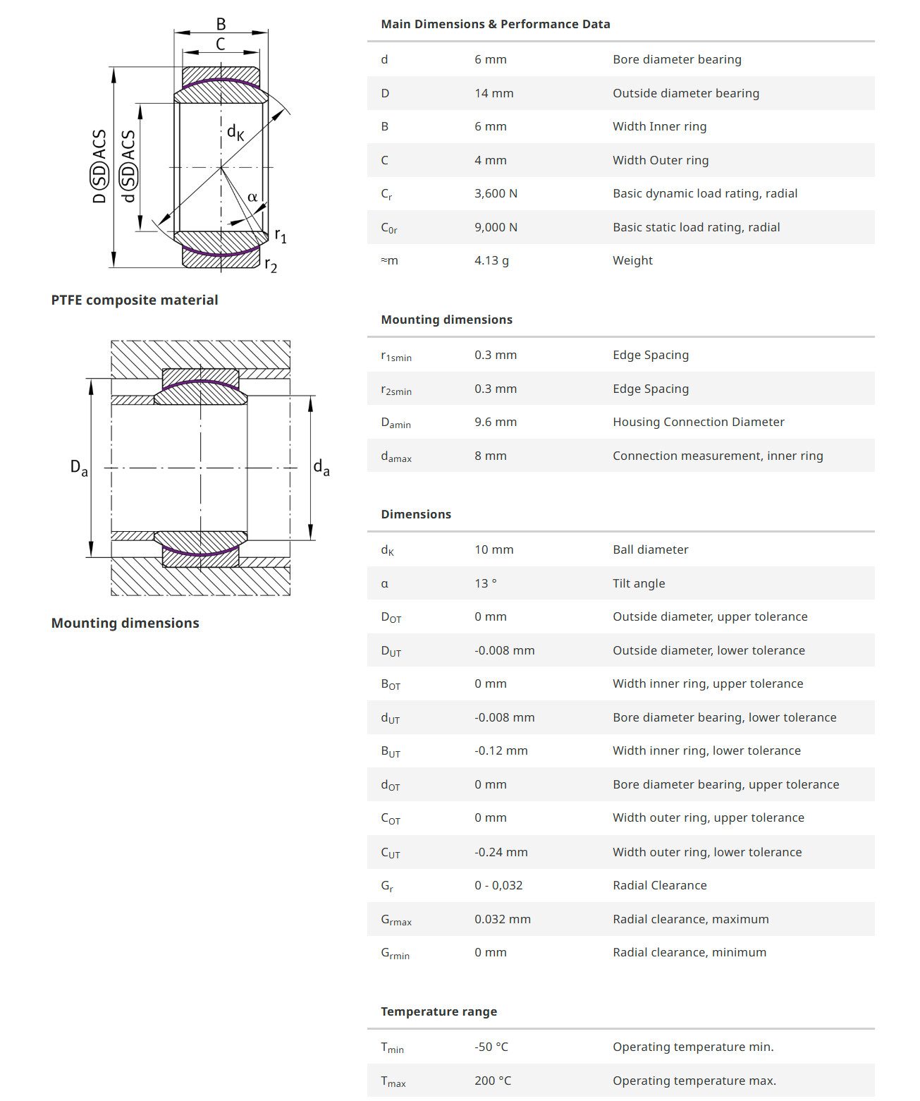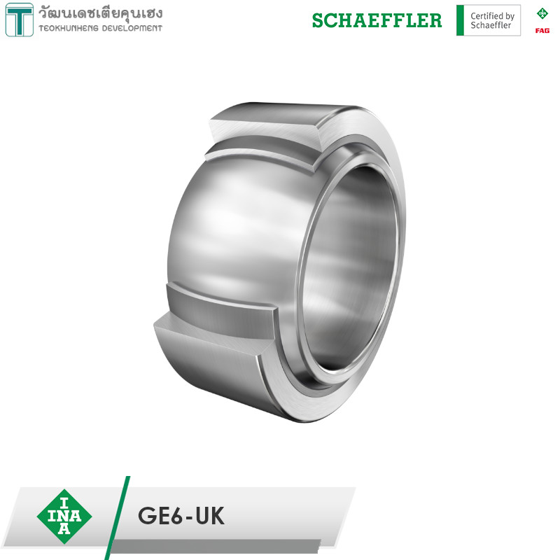 INA GE6-UK มีขนาดวงใน 6 มิล วงนอก 14 มิล หนา 6 มิล เป็นตลับลูกปืนตาเหลือก หรือตลับลูกปืนกาบเพลาผิวโค้ง แบบปรับแนวได้เอง เหมาะสำหรับงานที่มี misalignment รองรับแรงโหลดในแนวรัศมีและแนวแกนได้อย่างมีประสิทธิภาพ ตลับลูกปืนประเภทนี้จะไม่มีเม็ดลูกปืน ไม่ต้องเติมสารหล่อลื่นต่างๆ