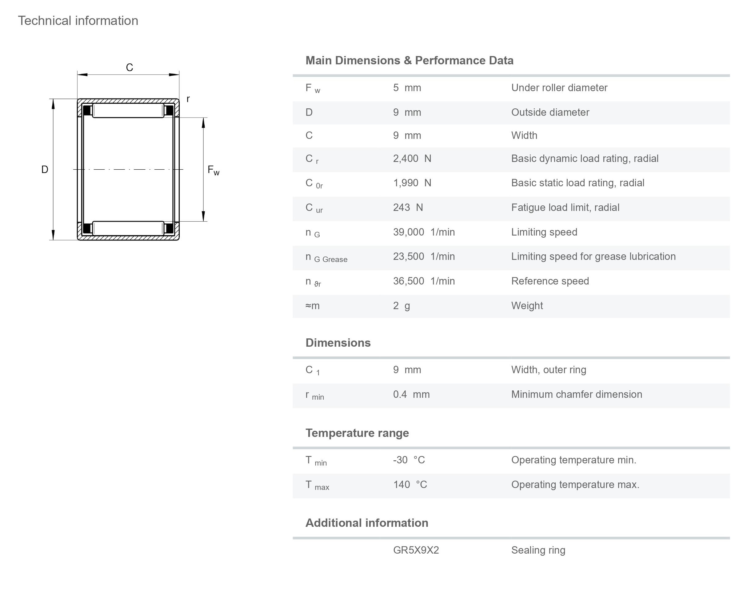 INA HK 0509 มีขนาดวงใน 5 มิล วงนอก 9 มิล หนา 9 มิล เป็นตลับลูกปืนเม็ดเข็มประเภท Drawn Cup มีเปลือกนอกบาง เม็ดลูกปืนทรงกระบอกเล็ก ตัวลูกปืนมีน้ำหนักเบา ส่วนมากจะใช้ในอุปกรณ์ที่มีพื้นที่จำกัด รองรับแรงโหลดได้สูงและรองรับความเร็วรอบสูง