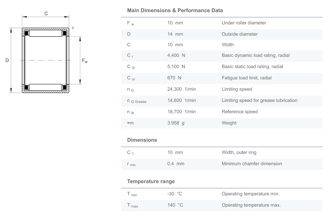 INA HK1010-AS1-B มีขนาดวงใน 10 มิล วงนอก 14 มิล หนา 10 มิล เป็นตลับลูกปืนเม็ดเข็มประเภท Drawn Cup มีเปลือกนอกบาง เม็ดลูกปืนทรงกระบอกเล็ก ตัวลูกปืนมีน้ำหนักเบา ส่วนมากจะใช้ในอุปกรณ์ที่มีพื้นที่จำกัด รองรับแรงโหลดได้สูงและรองรับความเร็วรอบสูง
