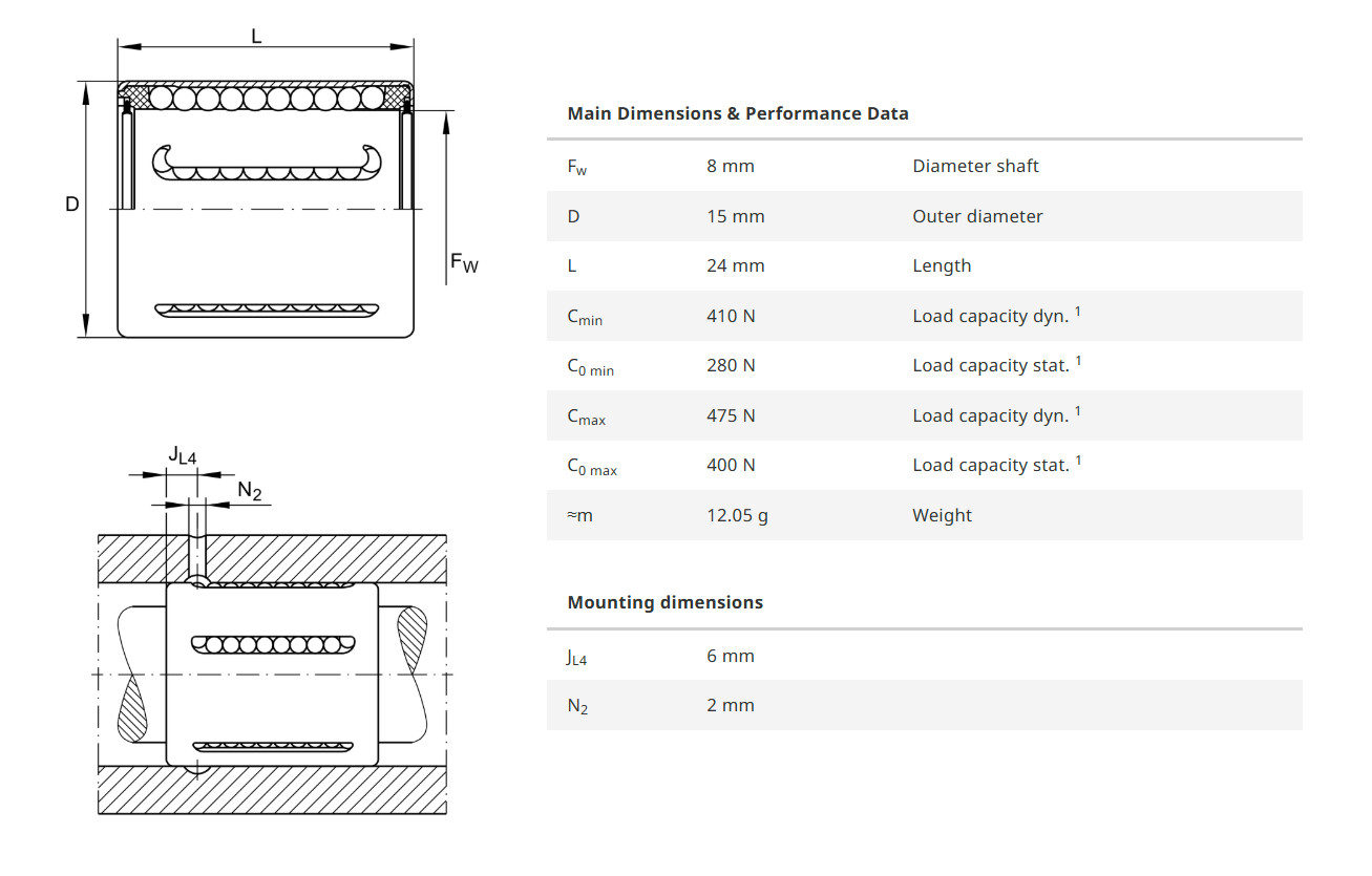 INA KH08-PP มีขนาดวงใน 8 มิล วงนอก 15 มิล ความยาว 24 มิล เป็นตลับลูกปืนเคลื่อนที่เชิงเส้น Linear Ball Bearing มีซีลกันฝุ่น มักพบได้บ่อยในเครื่องจักรอุตสาหกรรมอาหารและบรรจุภัณฑ์