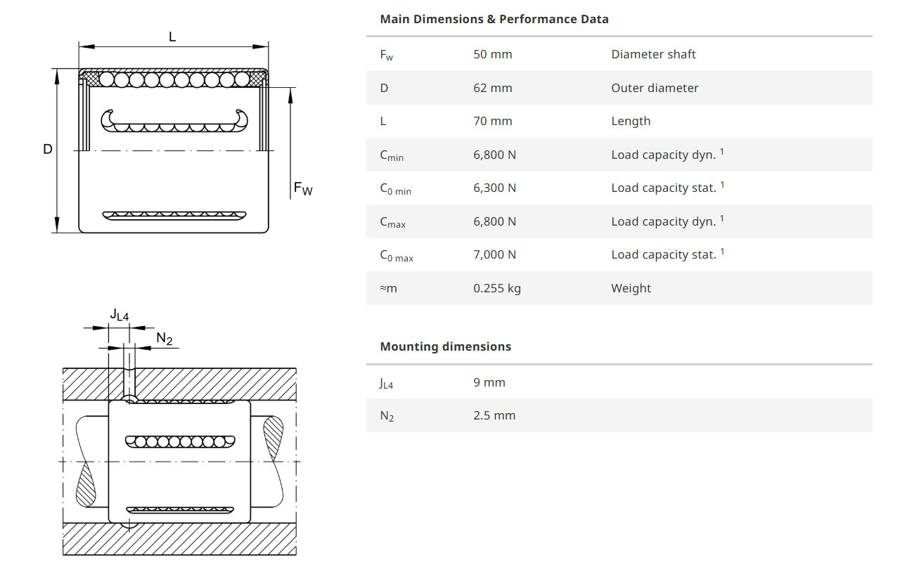 INA KH50-B มีขนาดวงใน 50 มิล วงนอก 62 มิล ความยาว 70 มิล เป็นตลับลูกปืนเคลื่อนที่เชิงเส้น Linear Ball Bearing มักพบได้บ่อยในเครื่องจักรอุตสาหกรรมอาหารและบรรจุภัณฑ์