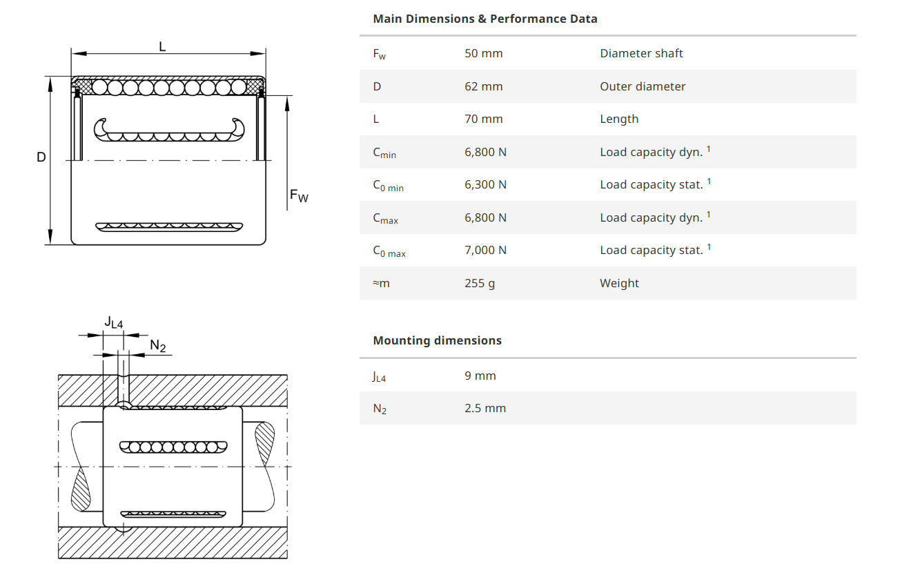 INA KH50-PP มีขนาดวงใน 50 มิล วงนอก 62 มิล ความยาว 70 มิล มีซีลกันฝุ่น เป็นตลับลูกปืนเคลื่อนที่เชิงเส้น Linear Ball Bearing มักพบได้บ่อยในเครื่องจักรอุตสาหกรรมอาหารและบรรจุภัณฑ์