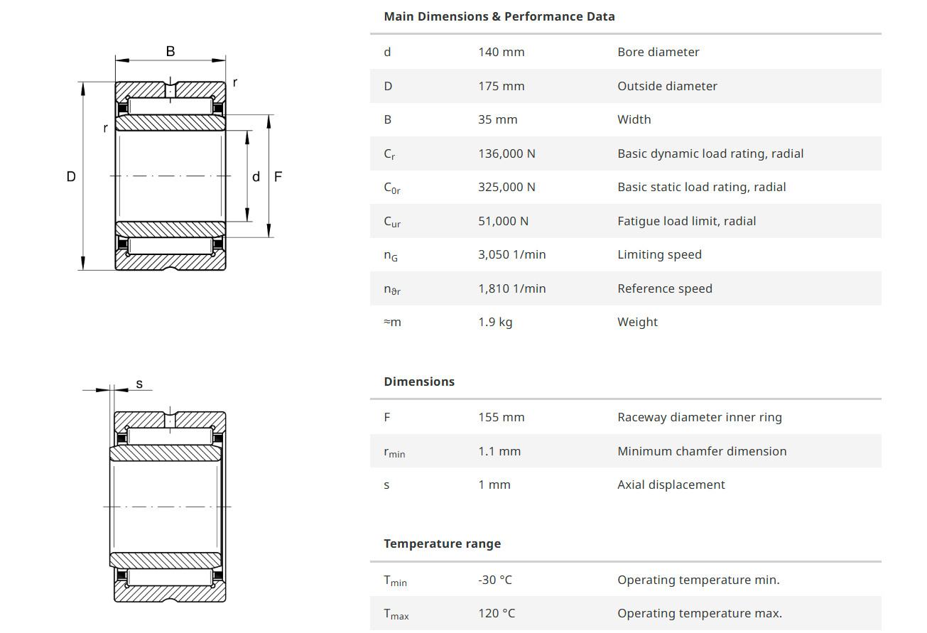 INA NA4828-XL มีขนาดวงใน 140 มิล วงนอก 175 มิล หนา 35 มิล เป็นตลับลูกปืนเม็ดเข็มประเภท Machined เม็ดลูกปืนทรงกระบอกเล็กแถวเดียว ตัวลูกปืนและวงนอกสามารถถอดประกอบแยกจากแกนในได้ ทำให้ง่ายต่อการติดตั้งและบำรุงรักษา รองรับแรงโหลดได้สูง
