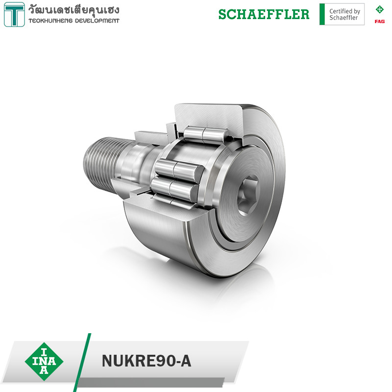 INA NUKRE90-A มีขนาด วงนอก 90 มิล เป็นตลับลูกปืนแทรคโรลเลอร์ (Track Roller) แบบมีแกน และปลอกคอลล่า เม็ดลูกปืนทรงกระบอกสองแถวแบบเรียงติดกัน ซึ่งออกแบบมาให้สามารถวิ่งบนรางหรือระบบคอนเวเยอร์ต่างๆ ได้ทุกประเภท โดยมีขนาดของวงนอกที่หนาเพื่อรองรับแรงโหลดในแนวรัศมีได้สูงมาก และยังสามารถรองรับแรงในแนวแกนได้อีกด้วย