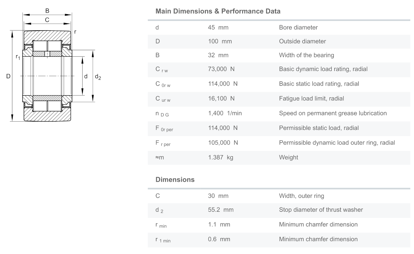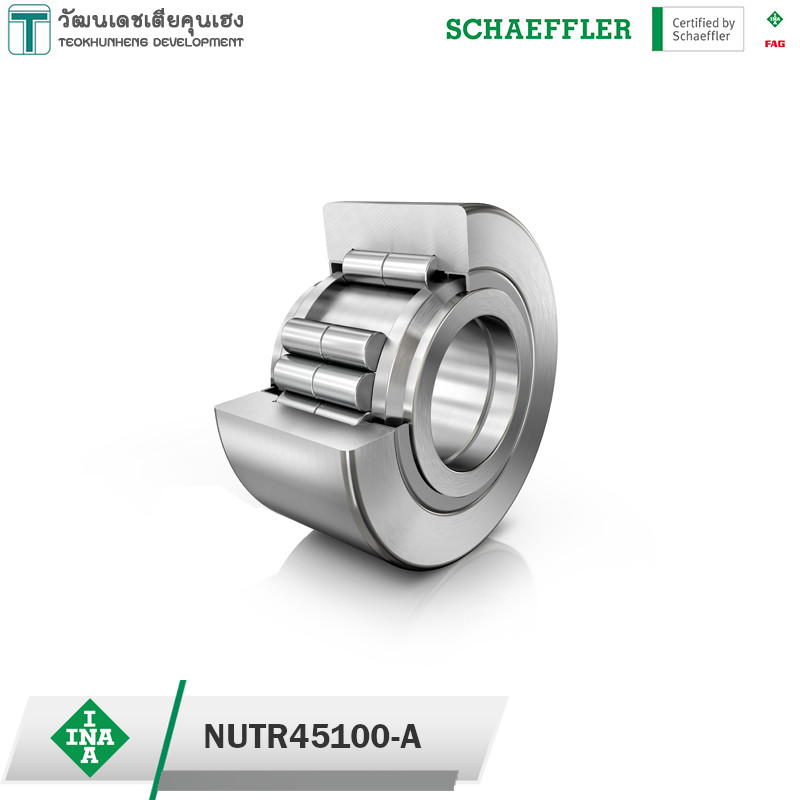 INA NUTR45100-A มีขนาดวงใน 45 มิล วงนอก 100 มิล หนา 32 มิล เป็นตลับลูกปืนแทรคโรลเลอร์ (Track Roller) แบบเม็ดทรงกระบอกสองแถว เม็ดลูกปืนเรียงติดกัน ซึ่งออกแบบมาให้สามารถวิ่งบนรางหรือระบบคอนเวเยอร์ต่างๆ ได้ทุกประเภท โดยมีขนาดของวงนอกที่หนาเพื่อรองรับแรงโหลดในแนวรัศมีได้สูงมาก และยังสามารถรองรับแรงในแนวแกนได้อีกด้วย