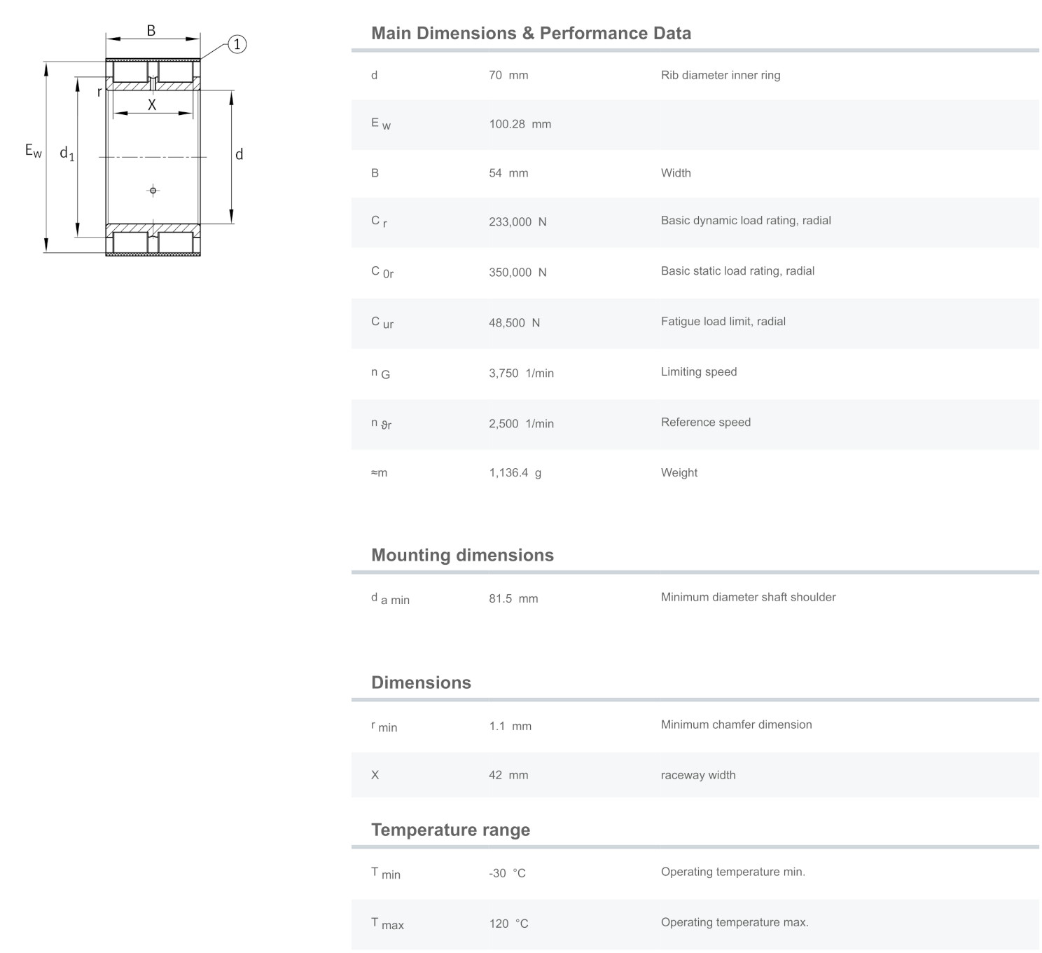 INA SL185014-A มีขนาดวงใน 70 มิล โตนอก 100.28 มิล หนา 54 มิล เป็นตลับลูกปืนเม็ดทรงกระบอกสองแถวแบบไร้รัง เม็ดลูกปืนเรียงชิดติดกัน ไม่มีแกนนอก(Outer ring) ความทนทานสูง รองรับแรงโหลดได้สูงมาก