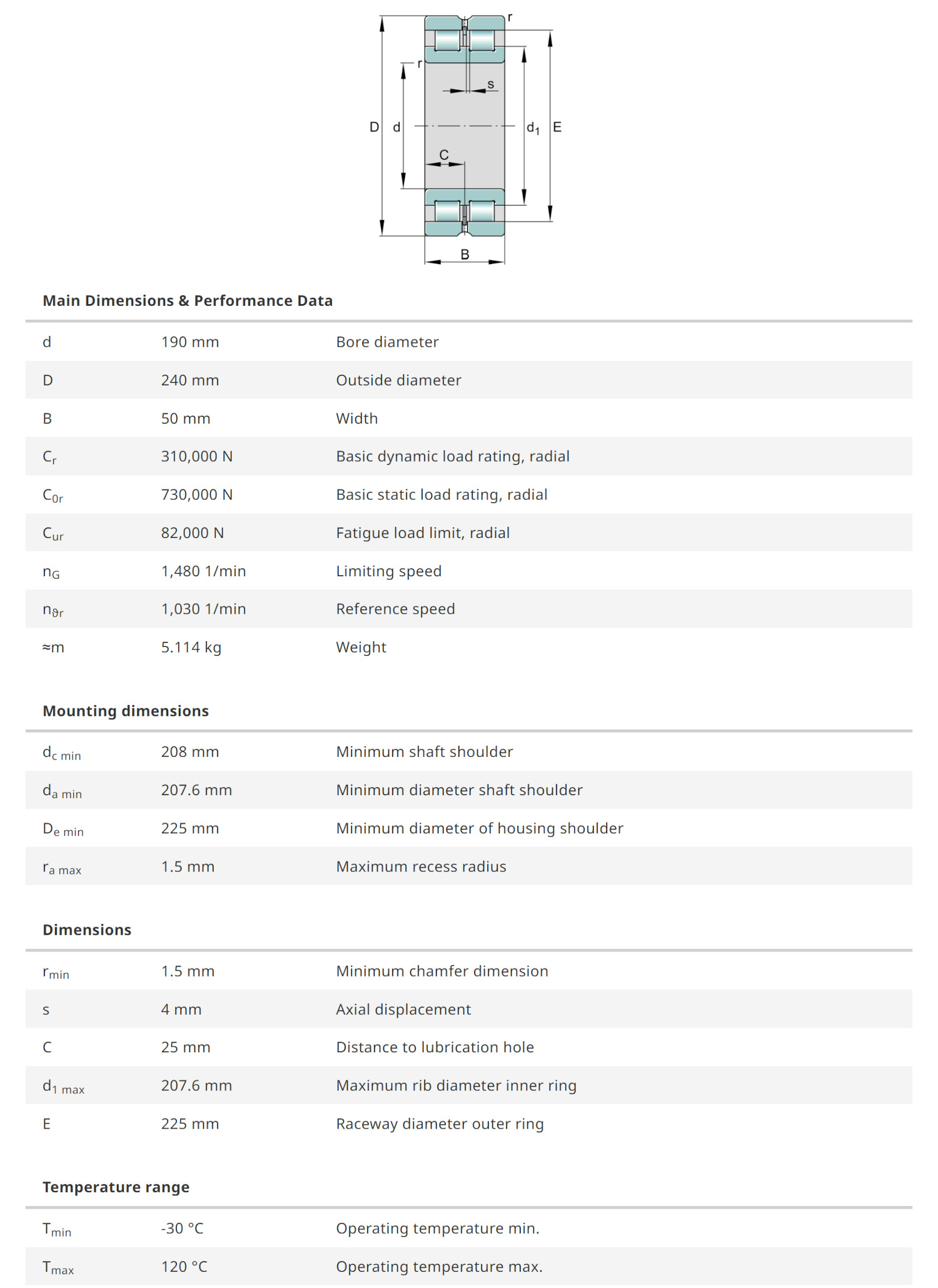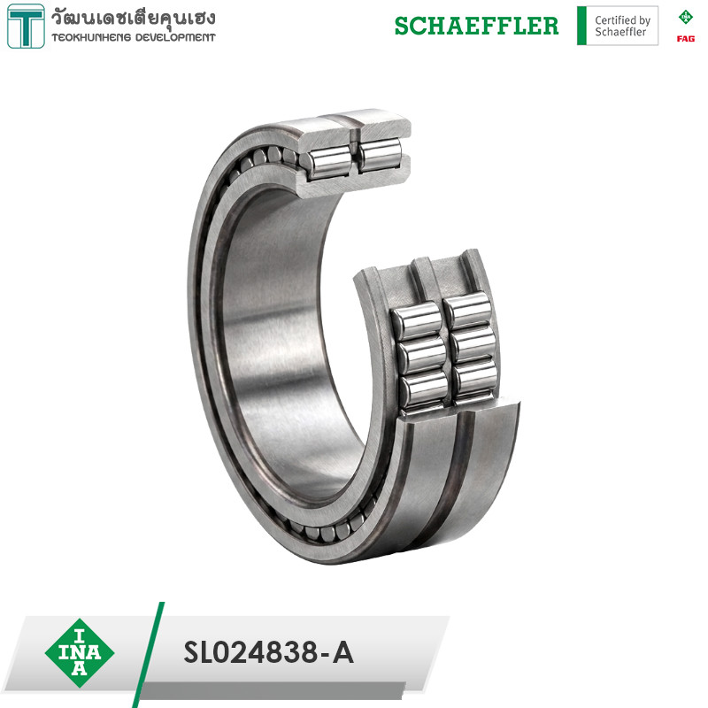 INA SL024838-A มีขนาดวงใน 190 มิล วงนอก 240 มิล หนา 50 มิล เป็นตลับลูกปืนเม็ดทรงกระบอกสองแถวแบบไร้รัง เม็ดลูกปืนเรียงชิดติดกัน ตลับลูกปืนมีความทนทานสูง รับแรงโหลดได้สูงมาก ใช้กับงานอุตสาหรกรรมหนัก