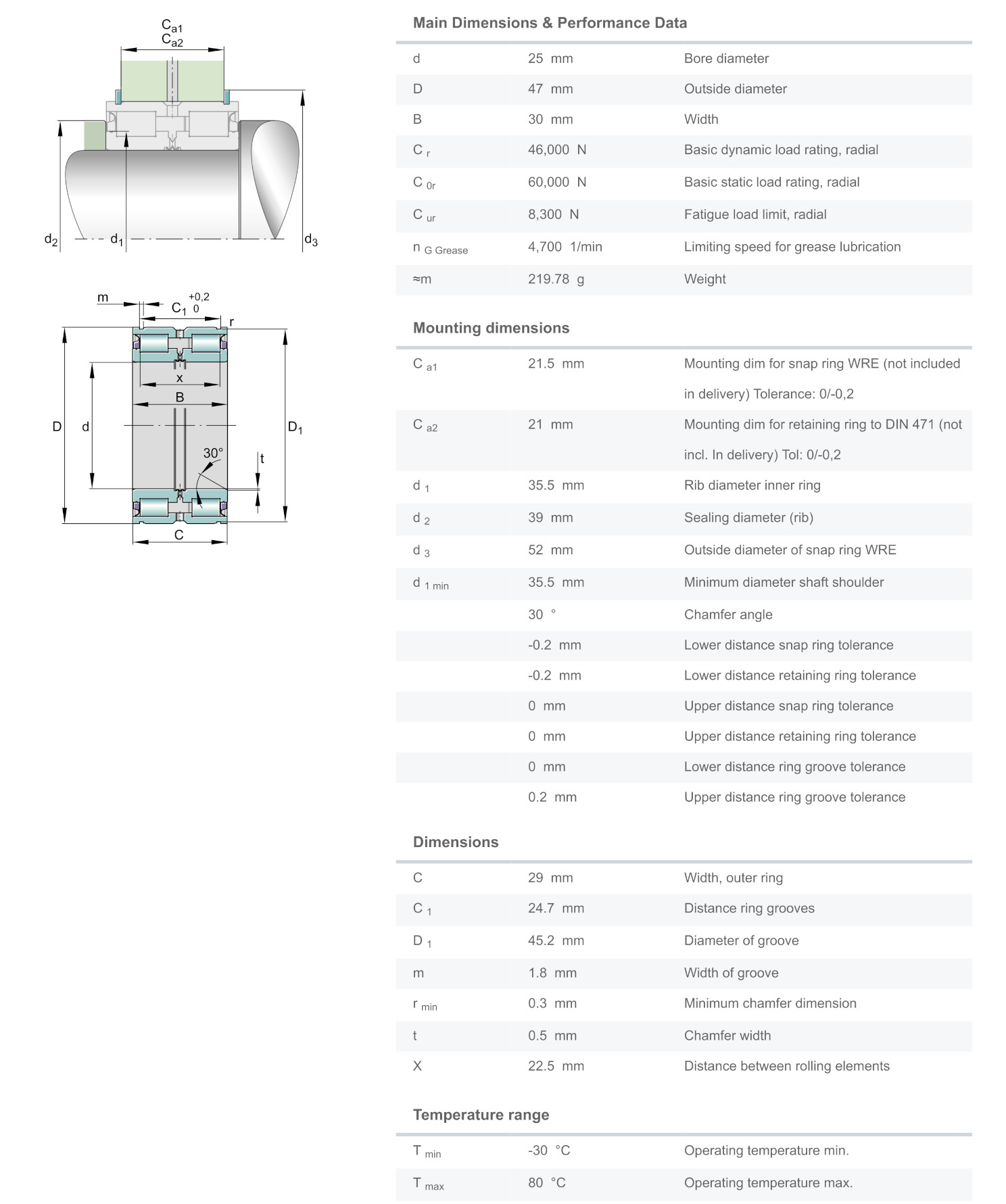 INA SL045005-PP-2NR มีขนาดวงใน 25 มิล วงนอก 47 มิล หนา 30 มิล เป็นตลับลูกปืนเม็ดทรงกระบอกสองแถวแบบไร้รัง เม็ดลูกปืนเรียงชิดติดกัน มีซีลกันฝุ่นและร่องแหวนที่วงนอก และเนื่องจากการที่ไม่มีรังจับลูกปืน ทำให้สามารถใส่เม็ดลูกปืนได้มากขึ้น จึงความทนทานสูง รองรับแรงโหลดได้มาก มักใช้งานกับรอกและเครน