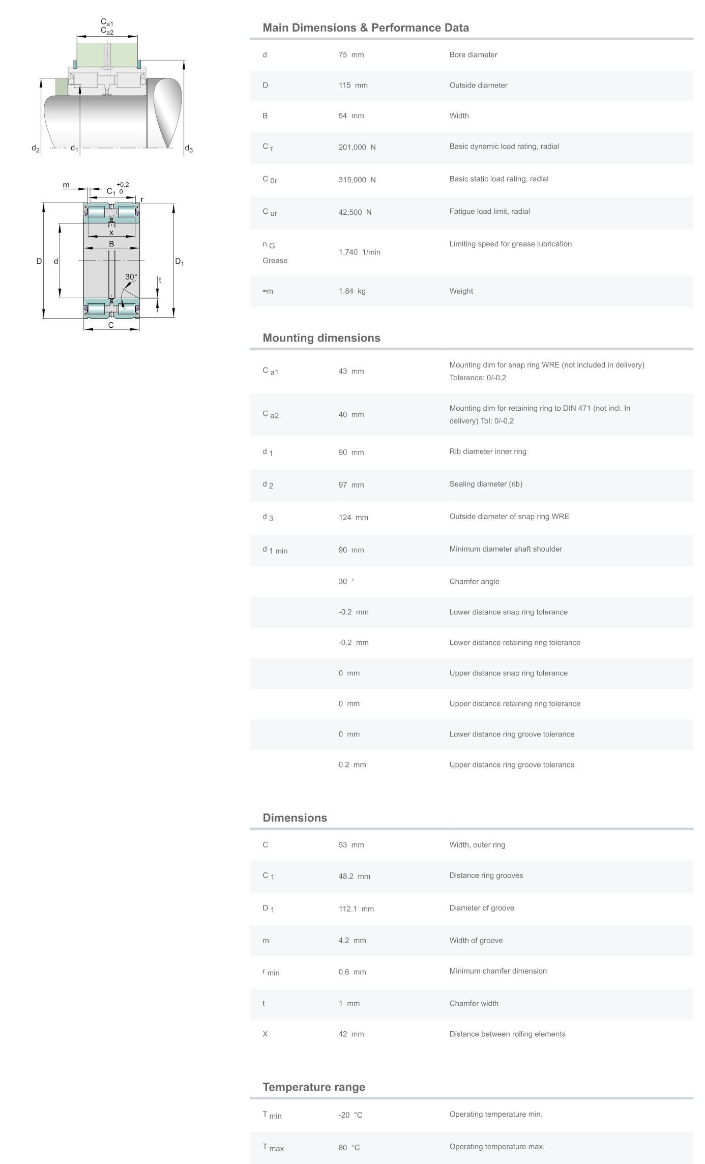 INA SL045015-PP-2NR มีขนาดวงใน 75 มิล วงนอก 115 มิล หนา 54 มิล เป็นตลับลูกปืนเม็ดทรงกระบอกสองแถวแบบไร้รัง เม็ดลูกปืนเรียงชิดติดกัน มีซีลกันฝุ่นและร่องแหวนที่วงนอก และเนื่องจากการที่ไม่มีรังจับลูกปืน ทำให้สามารถใส่เม็ดลูกปืนได้มากขึ้น จึงความทนทานสูง รองรับแรงโหลดได้มาก มักใช้งานกับรอกและเครน