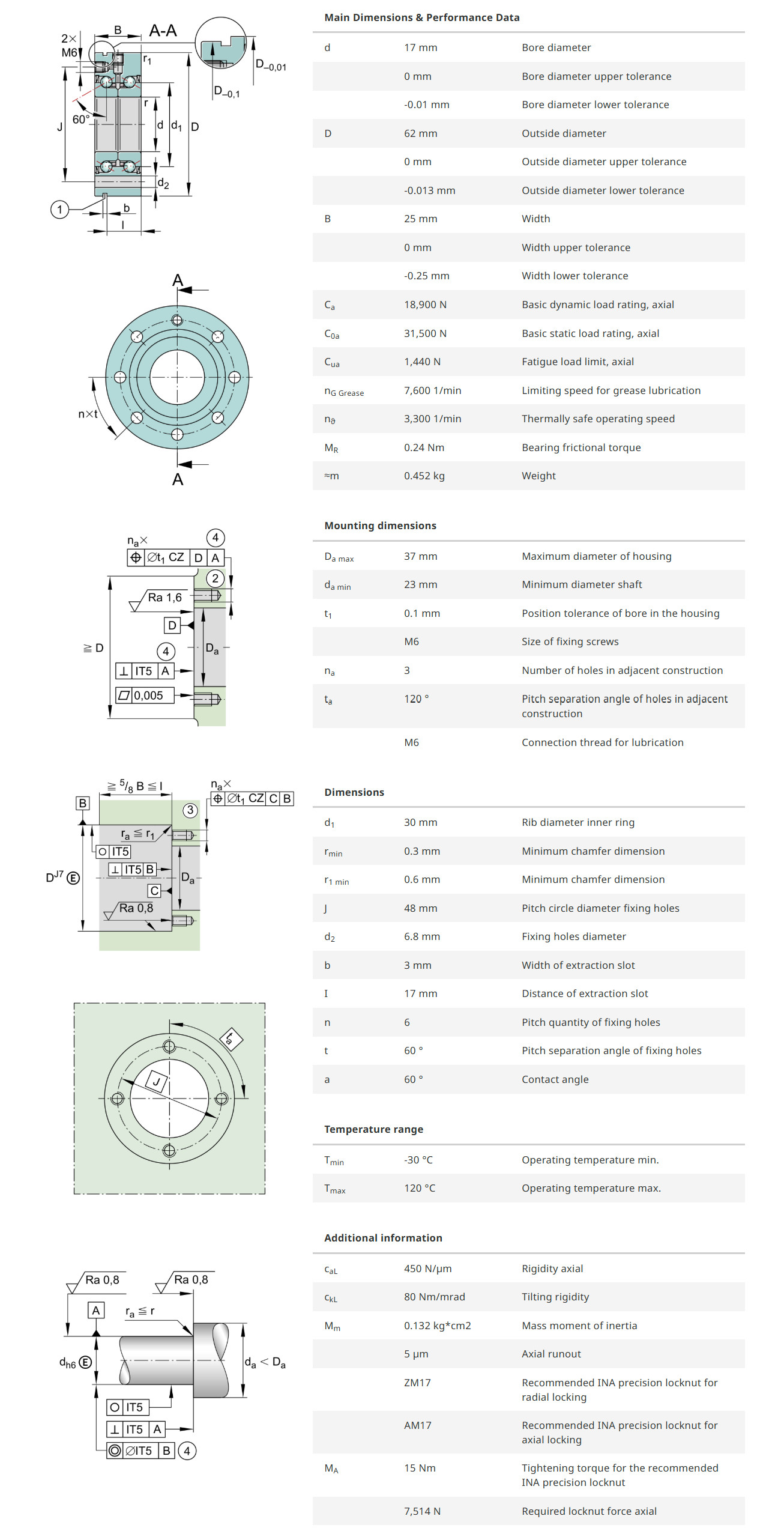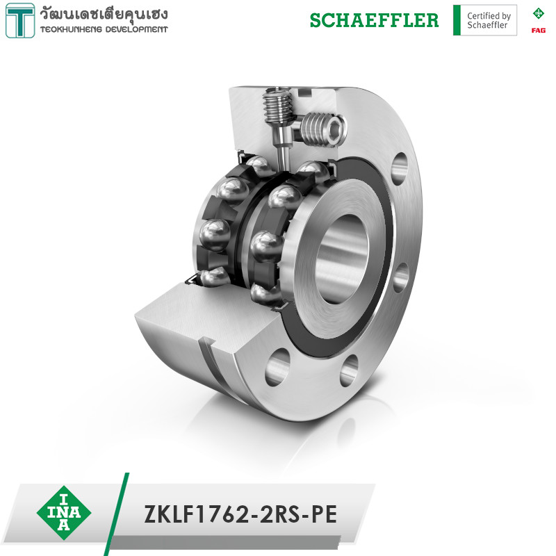 INA ZKLF1762-2RS-PE มีขนาดวงใน 17 มิล วงนอก 62 มิล หนา 25 มิล เป็นตลับลูกปืนความเที่ยงตรงสูง เม็ดกลมแบบมีมุมสัมผัส 60° องศา ประกบสองแถว มีซีลทั้งสองด้าน มีค่าความแม่นยำสูง ใช้สำหรับงานซัพพอร์ตบอลสกรู รองรับแรงในแนวแกนได้เป็นอย่างดี