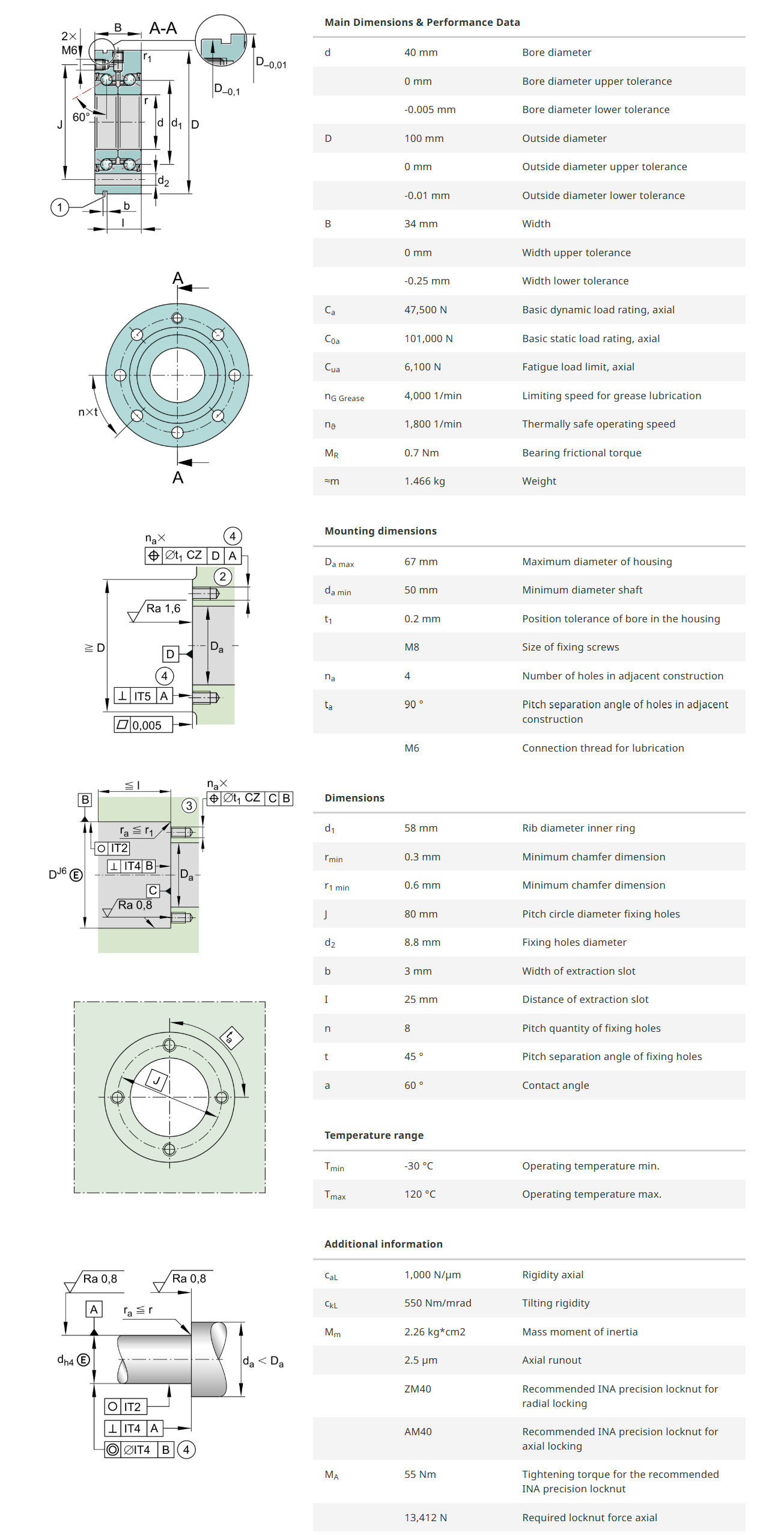INA ZKLF40100-2RS-XL มีขนาดวงใน 40 มิล วงนอก 100 มิล หนา 34 มิล เป็นตลับลูกปืนความเที่ยงตรงสูง เม็ดกลมแบบมีมุมสัมผัส 60° องศา ประกบสองแถว มีซีลทั้งสองด้าน มีค่าความแม่นยำสูง ใช้สำหรับงานซัพพอร์ตบอลสกรู รองรับแรงในแนวแกนได้เป็นอย่างดี