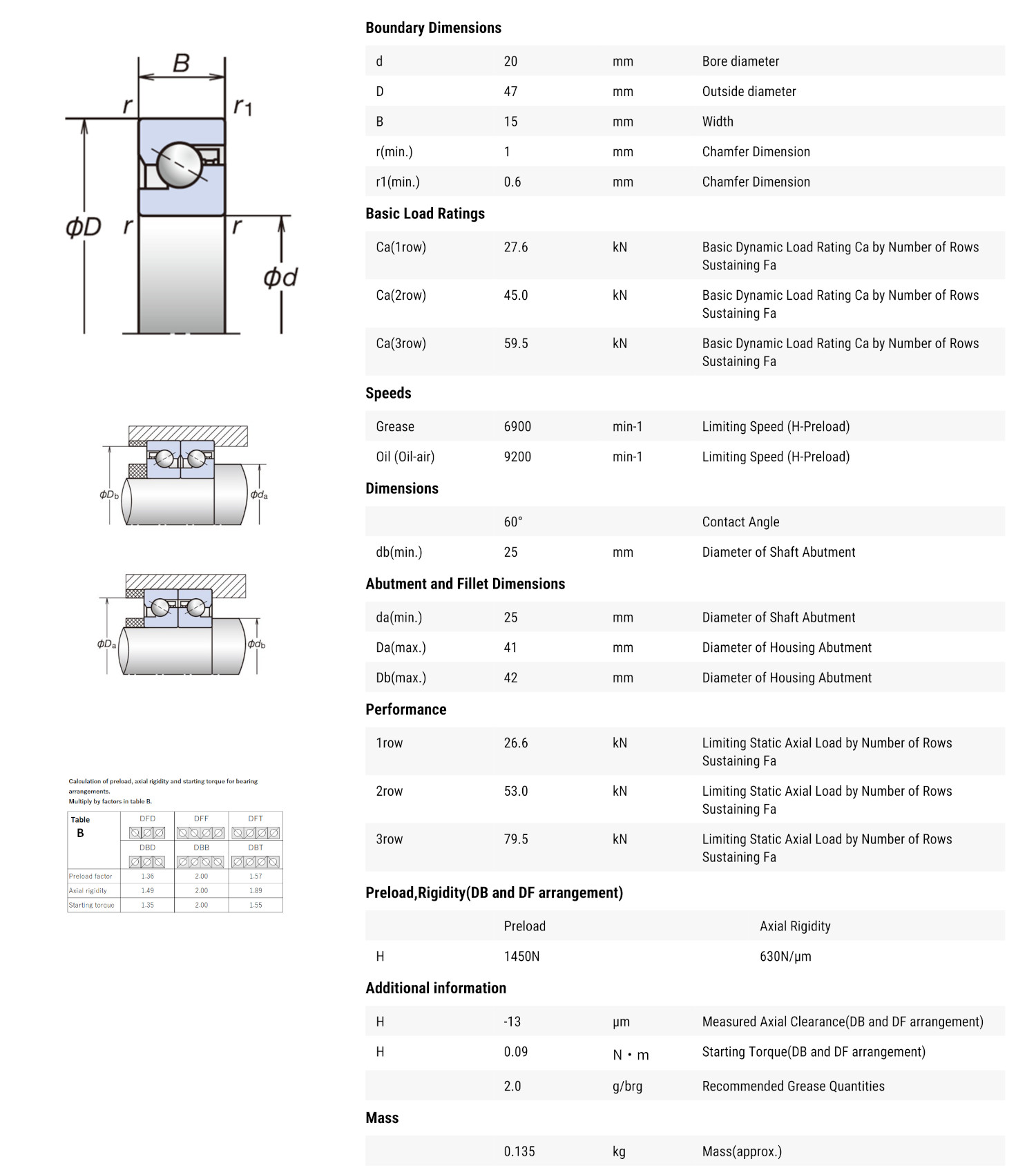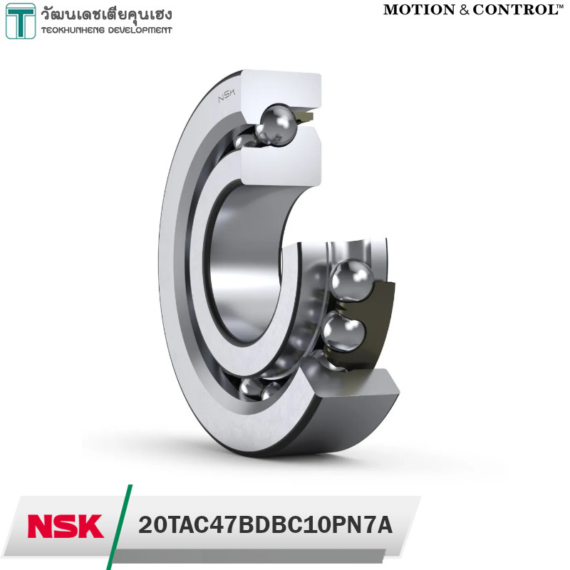 NSK 20TAC47BDBC10PN7A มีขนาดวงใน 17 มิล วงนอก 47 มิล หนา 15 มิล เป็นตลับลูกปืนความเที่ยงตรงสูงเม็ดกลมแบบมีมุมสัมผัส 60° องศา รุ่นประกบคู่แบบ DB ใช้สำหรับงานซัพพอร์ตบอลกรู รองรับแรงในแนวแกนได้เป็นอย่างดี