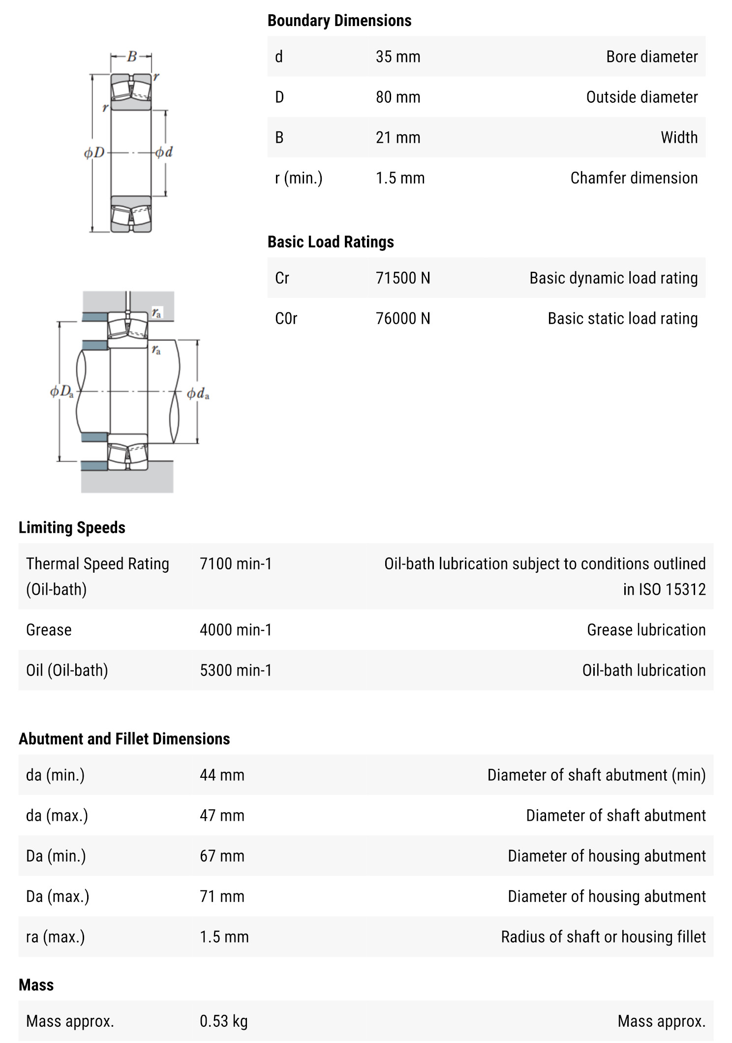 NSK 21307CDE4C3S11 มีขนาดวงใน 35 มิล วงนอก 80 มิล หนา 21 มิล เป็นตลับลูกปืนเม็ดโค้งสองแถวแบบให้ตัวได้ แกนในรูตรง มีรูสำหรับเติมจารบีได้ สามารถรองรับแรงโหลดสูงทั้งในแนวรัศมีและแนวแกน