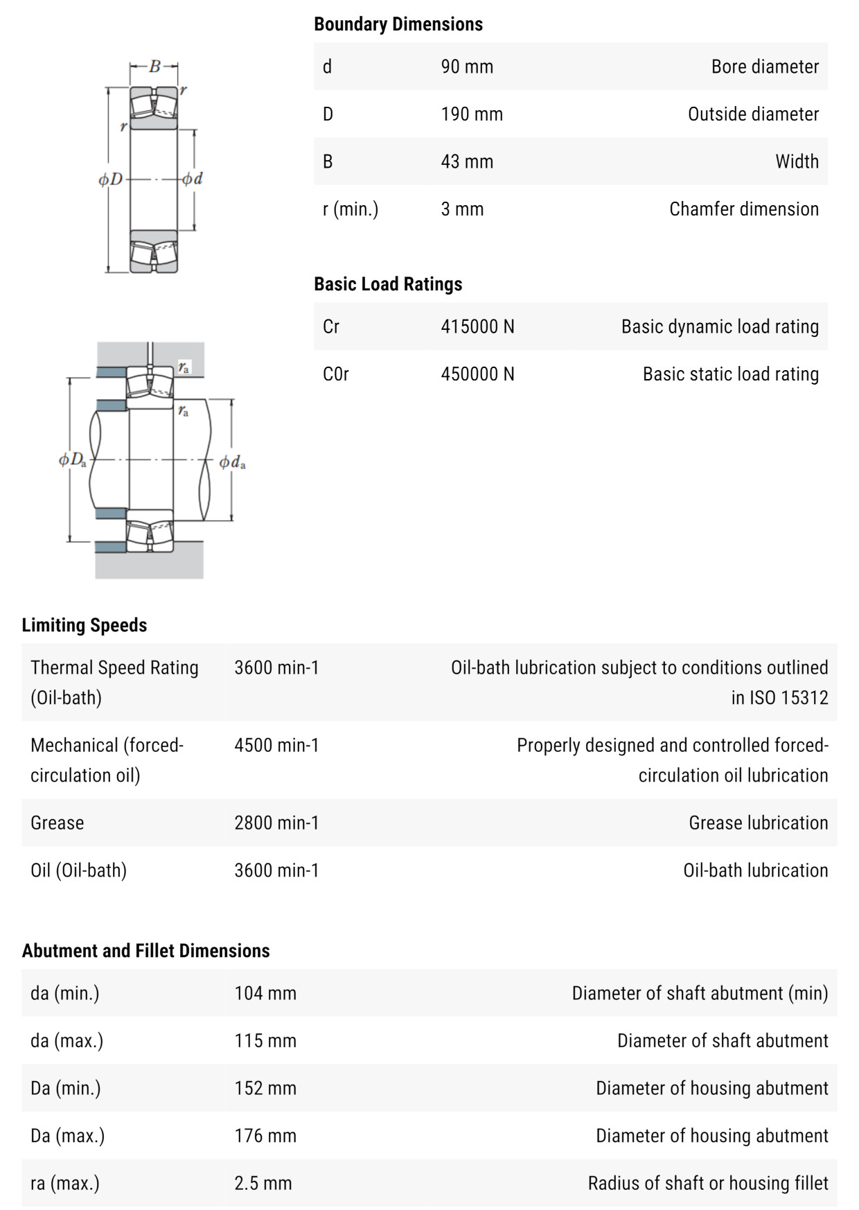 NSK 21318 EAE4C3 มีขนาดวงใน 90 มิล วงนอก 190 มิล หนา 43 มิล เป็นตลับลูกปืนเม็ดโค้งสองแถวแบบให้ตัวได้ แกนในรูตรง มีรูสำหรับเติมจารบีได้ สามารถรองรับแรงโหลดสูงทั้งในแนวรัศมีและแนวแกน