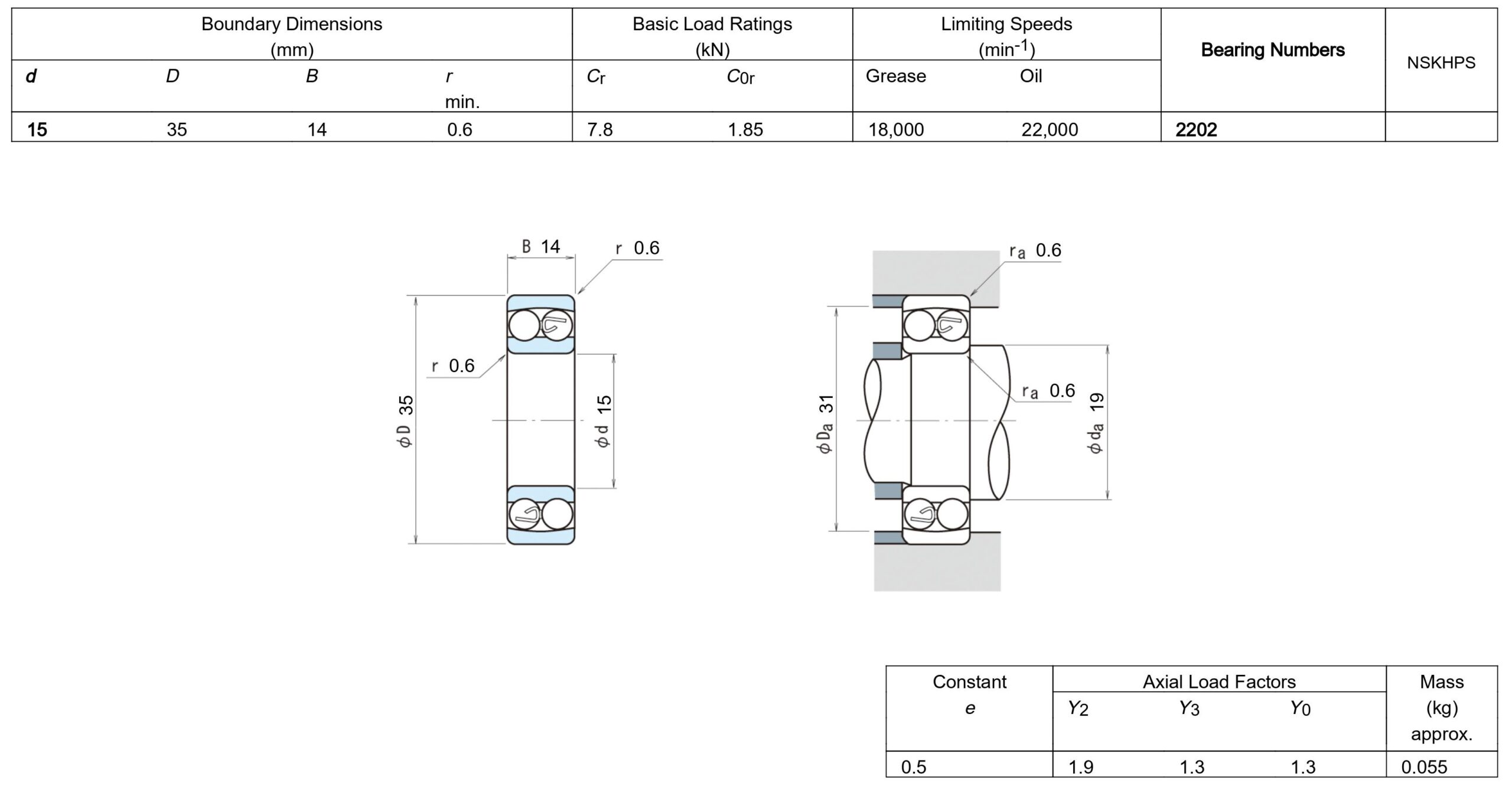 NSK 2202 มีขนาดวงใน 15 มิล วงนอก 35 มิล หนา 14 มิล เป็นตลับลูกปืนเม็ดกลมสองแถว แบบปรับแนวได้เอง รองรับแรงจากการเยื้องศูนย์ของเพลาได้ดี ความร้อนต่ำแม้ทำงานด้วยความเร็วรอบสูง