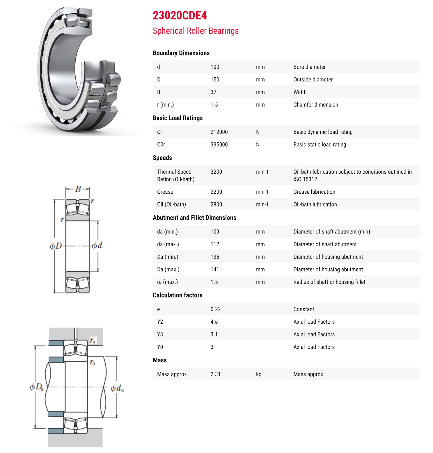 NSK 23020 CDE4C3 มีขนาดวงใน 100 มิล วงนอก 150 มิล หนา 37 มิล เป็นตลับลูกปืนเม็ดโค้งสองแถวแบบให้ตัวได้ เป็นลูกปืนแกนในรูตรง มีรูสำหรับเติมจารบีได้ สามารถรองรับแรงโหลดสูงทั้งในแนวรัศมีและแนวแกน