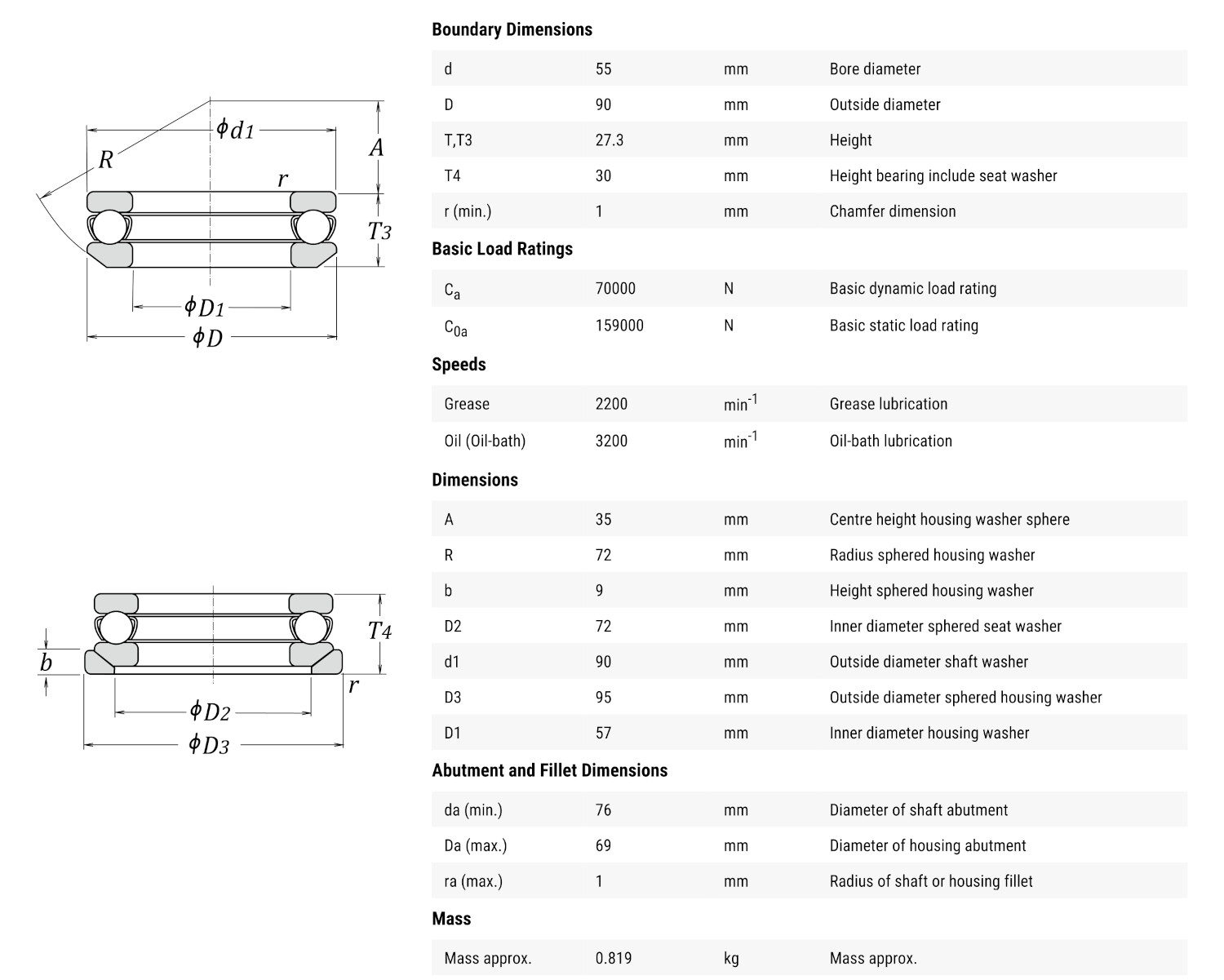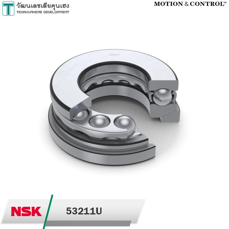 NSK 53211U มีขนาดวงใน 55 มิล วงนอก 90 มิล หนารวม 30 มิล เป็นตลับลูกปืนกันรุนเม็ดกลม มีฝาประกบ 2 ด้าน ที่สามารถแยกถอดประกอบได้ ทำให้สะดวกต่อการติดตั้ง สามารถรองรับแรงโหลดได้สูงในแนวแกน