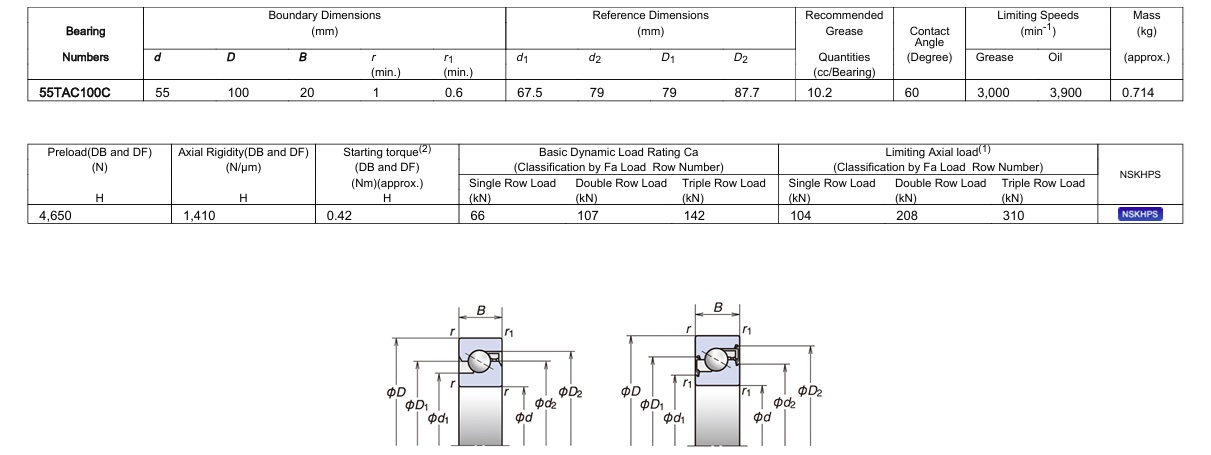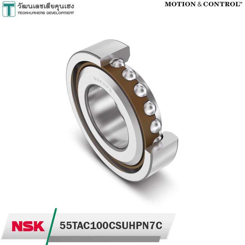 NSK 55TAC100CSUHPN7C มีขนาดวงใน 55 มิล วงนอก 100 มิล หนา 20 มิล เป็นตลับลูกปืนความเที่ยงตรงสูงเม็ดกลมแบบมีมุมสัมผัส 60° องศา มีค่าความแม่นยำ Class PN7C รุ่นเดี่ยว ใช้สำหรับงานซัพพอร์ตบอลกรู รองรับแรงในแนวแกนได้เป็นอย่างดี
