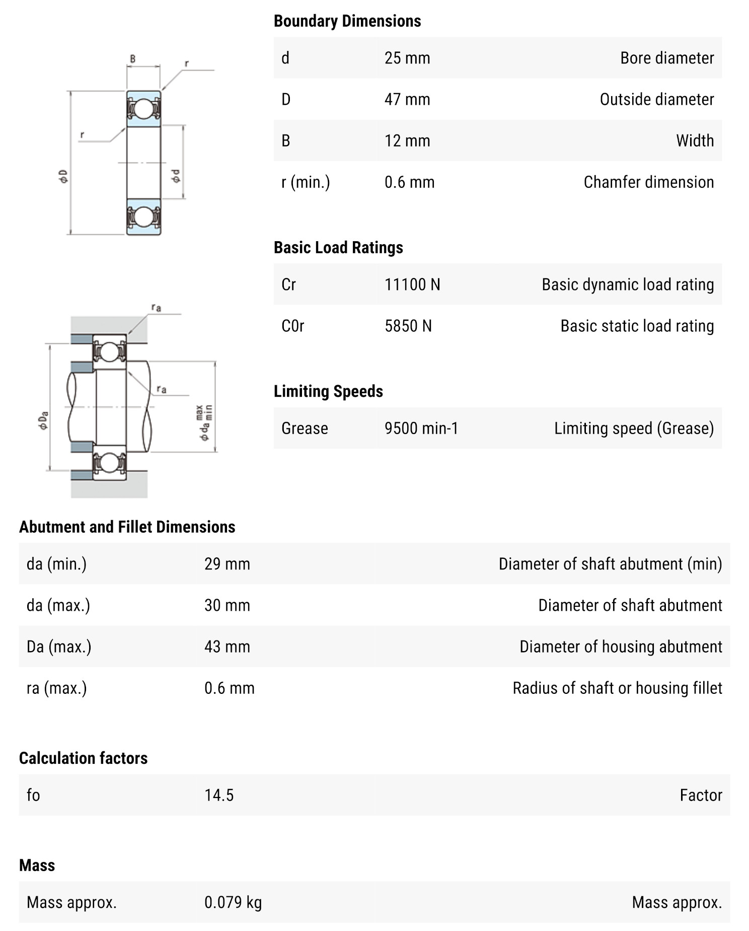 NSK 6005 DDUCM มีขนาดวงใน 25 มิล วงนอก 47 มิล หนา 12 มิล เป็นตลับลูกปืนเม็ดกลมร่องลึก ฝายางแบบสัมผัสสองด้าน แถวเดียว มีแรงเสียดทานต่ำ เสียงเงียบ สามารถรองรับความเร็วรอบสูง รองรับแรงทั้งแนวรัศมีและแนวแกน